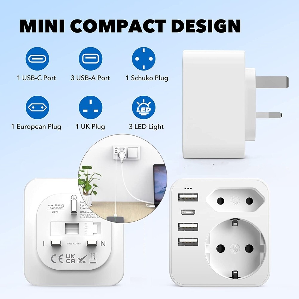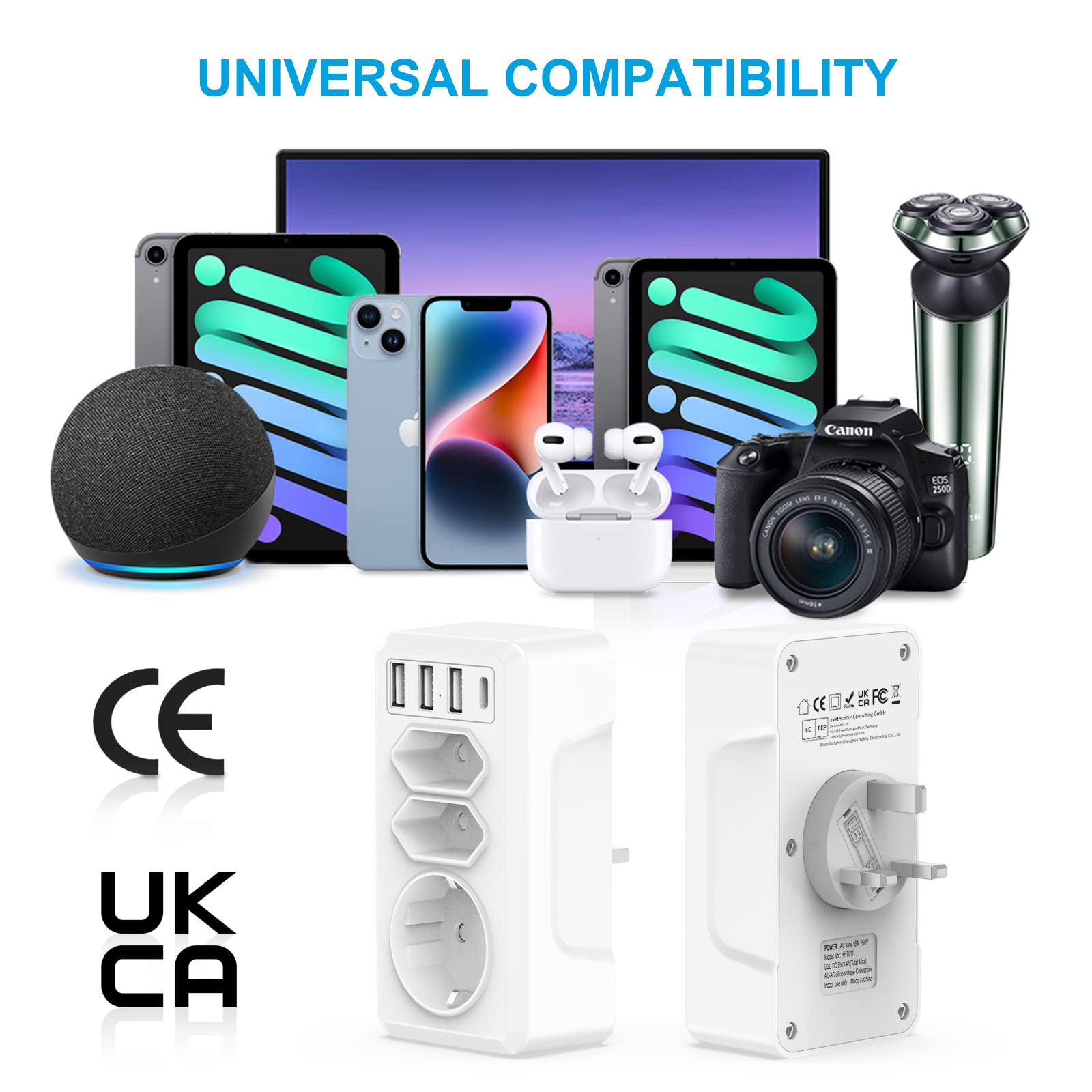 Reisestress ade! Dieser 7-in-1 Reiseadapter ist dein bester Begleiter für Reisen ins UK, nach Irland, Dubai, Malta und über 30 weitere Länder. Mit 3 Schuko-Steckdosen (bis 3250W) und 4 USB-Ports (2x USB-C, 2x USB-A) - lade bis zu 7 Geräte gleichzeitig!