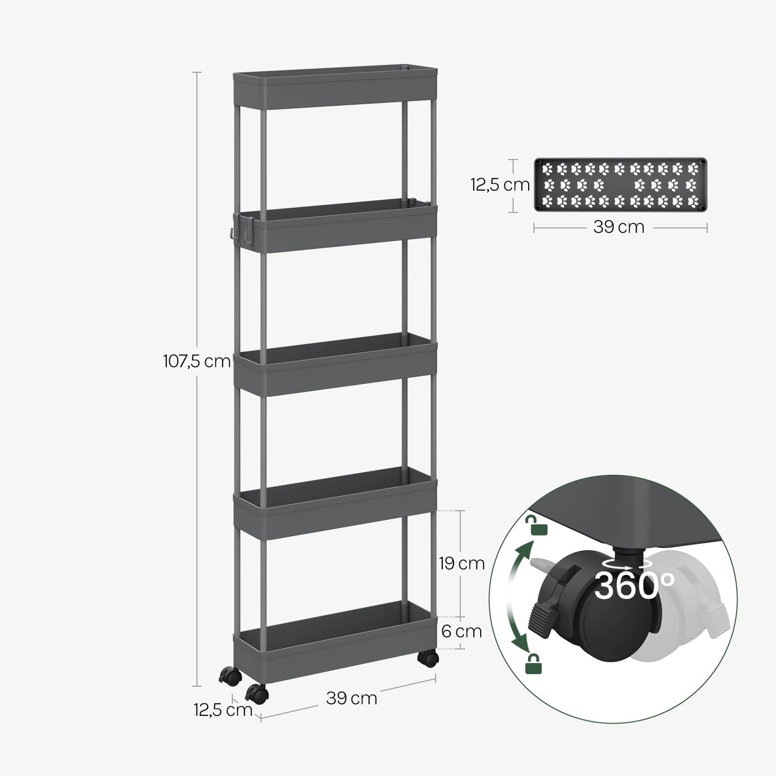 Dieser Klihome Servierwagen ist ein echter Alleskönner! 4 Ebenen bieten jede Menge Stauraum - 39x84x20,5cm perfekt für kleine Räume. Mit 4 Haken für zusätzlichen Stauraum.
