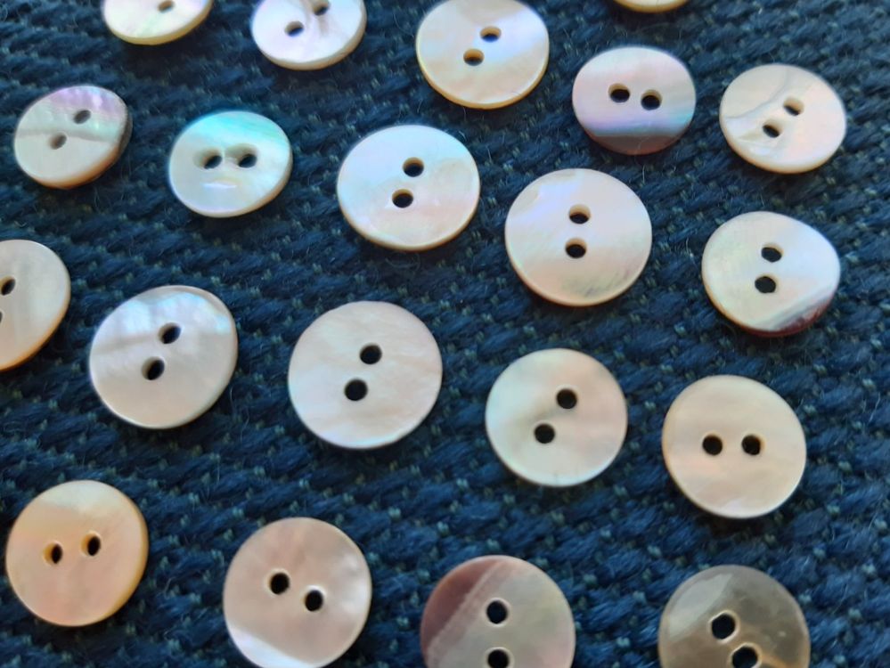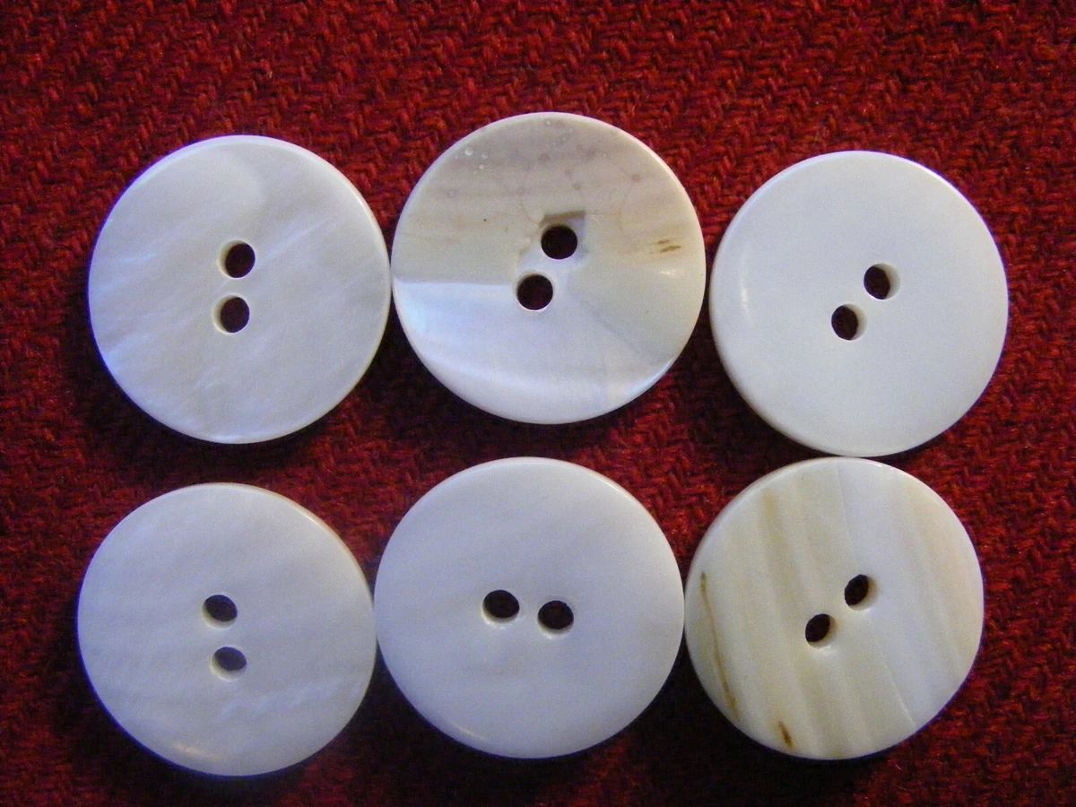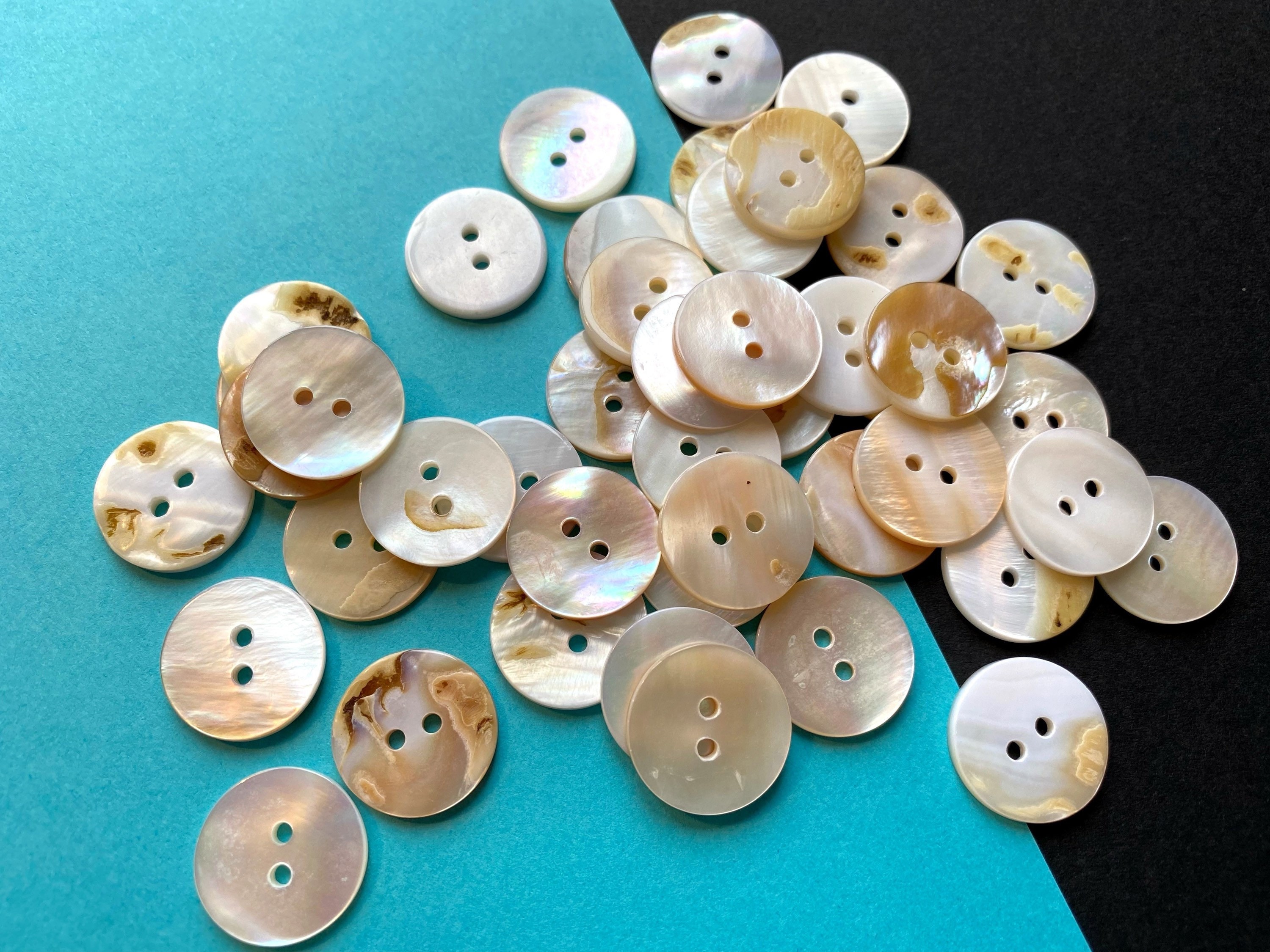 Wunderschöne natürliche Knöpfe! 6 Stück echte Perlmutt-Knöpfe in 15mm Größe, jeweils mit 2 Löchern. In cremeweiß mit zartem Regenbogenschimmer - jedes Stück einzigartig! Etwas dicker und hochwertiger verarbeitet, made in Europe. Perfekt für Blusen, Cardigans oder andere Nähprojekte, wo es was Besonderes sein soll. Der natürliche Schimmer macht jedes Kleidungsstück zum Hingucker. Einfach annähen und sich an dem edlen Look freuen!