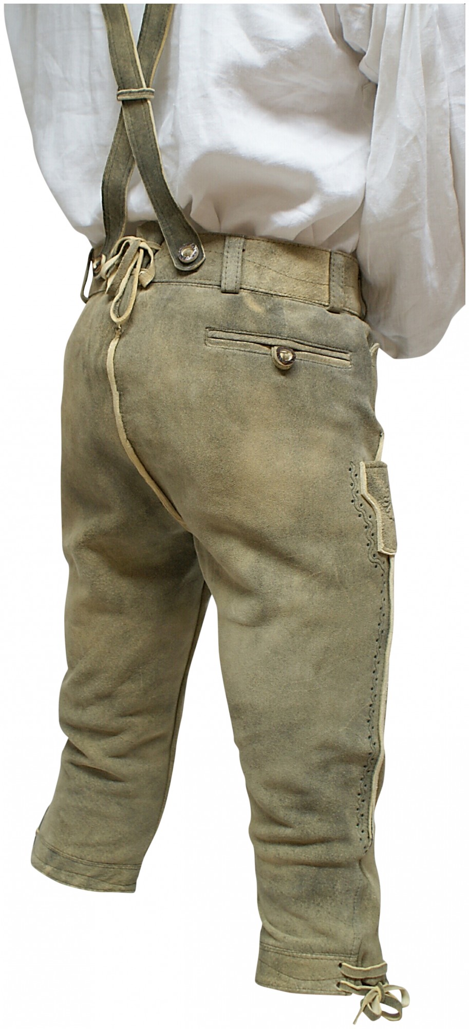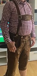 Prost! Mit dieser authentischen Lederhose bist du auf jedem Oktoberfest oder Volksfest der Hit! Aus echtem Rinds-Veloursleder gefertigt, liegt sie super angenehm auf der Haut. Der klassische Kniebund und die traditionellen Verzierungen wie die Messertasche und Hirschhornknöpfe machen die Hose zum echten Hingucker. Die passenden Hosenträger aus Echtleder sind im Lieferumfang enthalten. Praktisch: Der Bund ist durch einen Zwickel verstellbar, sodass die Hose optimal sitzt. Ob auf dem Münchner Oktoberfest, beim Dorffest oder auf der Wiesn - in dieser Trachtenhose machst du immer eine gute Figur! Die Verarbeitung ist hochwertig und die Hose hält ewig. Perfekt kombiniert mit einem Trachtenhemd und Haferlschuhen. Ein Must-Have für alle Volksfest-Fans und jeden, der traditionelle bayerische Tracht liebt. Achtung: Vor dem Bestellen unbedingt die Größentabelle checken für die perfekte Passform. Dann steht dem gemütlichen Biergenuss nichts mehr im Weg!