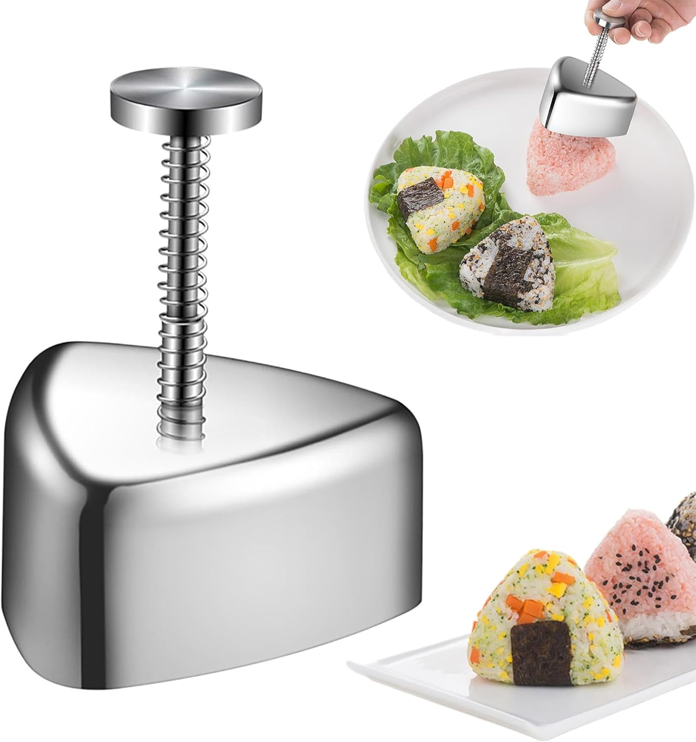 Mach deine eigenen Onigiri wie ein Profi! Dieses Sushi-Maker-Set aus Edelstahl ist perfekt für alle Japan-Küchen-Fans. Die dreieckigen Formen sind aus lebensmittelechtem 304er Edelstahl und haben eine Antihaft-Beschichtung - der Reis klebt nicht an und die Onigiri lassen sich super leicht herauslösen. Das federbelastete Design macht die Handhabung besonders einfach: Einfach Reis einfüllen, Deckel draufdrücken und schon hast du perfekte dreieckige Reisbällchen! Ideal für Sushi, Onigiri oder auch für kleine Burger-Patties. Kompakt und leicht, passt in jede Küchenschublade. Perfekt für Familien - auch Kinder haben Spaß beim Zubereiten! Du kannst dem Reis verschiedene Zutaten hinzufügen wie getrocknete Fleischfasern, Sesam oder Gemüse für abwechslungsreiche Füllungen. Einfach zu reinigen und spülmaschinenfest. Ob fürs Lunchbox, Picknick oder Party - mit diesen Formen werden deine Reisbällchen zum Hit!