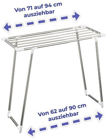 Platzprobleme? Diese klappbare Kleiderstange aus Edelstahl ist die Lösung! Sie lässt sich von 35cm auf volle 133cm Höhe ausziehen und bietet Platz für bis zu 4kg Wäsche. Superleicht mit nur 0,51kg - perfekt für Reisen, Camping oder die kleine Wohnung. Die rutschfesten Gummifüße schützen deine Böden vor Kratzern. Einfach ausklappen, aufstellen und schon hast du eine stabile Ablagemöglichkeit für Jacken, Handtücher oder frisch gewaschene Wäsche. Im zusammengeklappten Zustand passt sie in jeden Rucksack. Ob im Hotel, Wohnheim, Wohnmobil oder auf dem Balkon - dieser vielseitige Wäscheständer ist immer praktisch. Inklusive Aufbewahrungstasche für unterwegs. Endlich Ordnung auch auf engstem Raum!