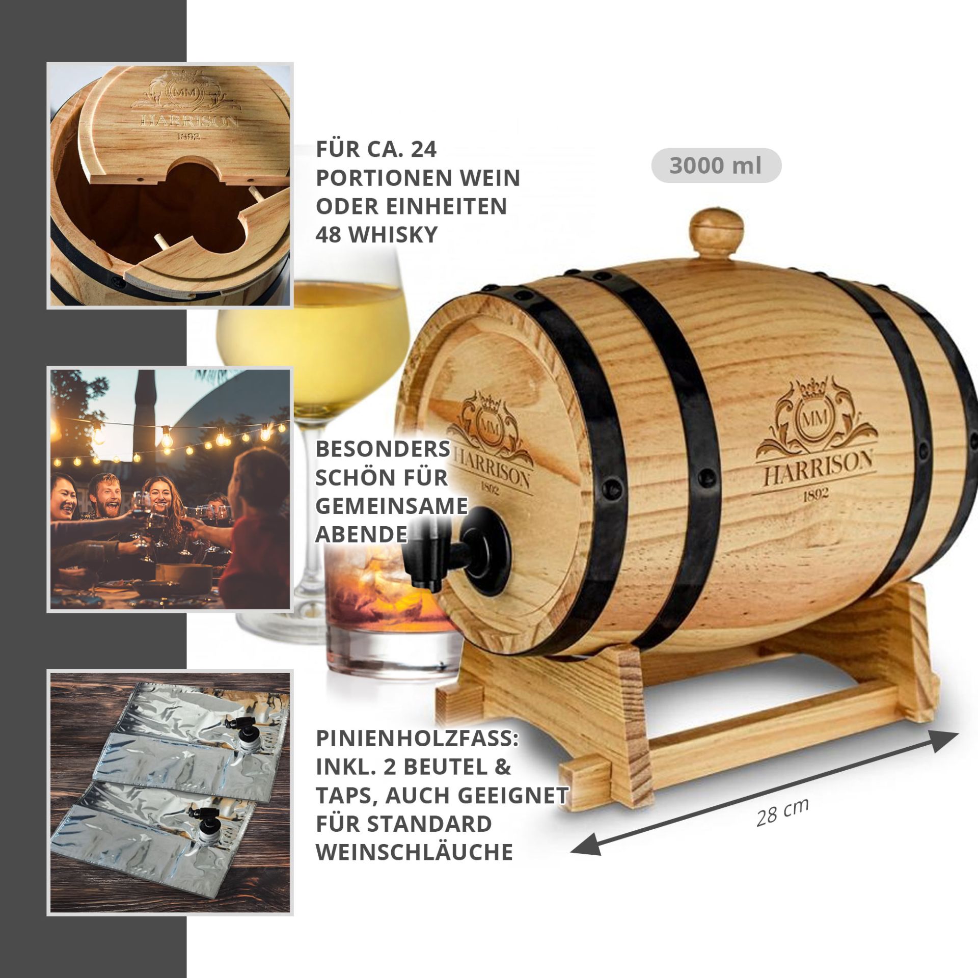Mann, dieses Holzfass ist ja mal richtig klasse! Aus unlackiertem Eichenholz, 3 Liter Fassungsvermögen und mit persönlicher Gravur. Da kannst du den Namen und ne Jahreszahl reinschreiben lassen - wird ein richtig persönliches Geschenk.