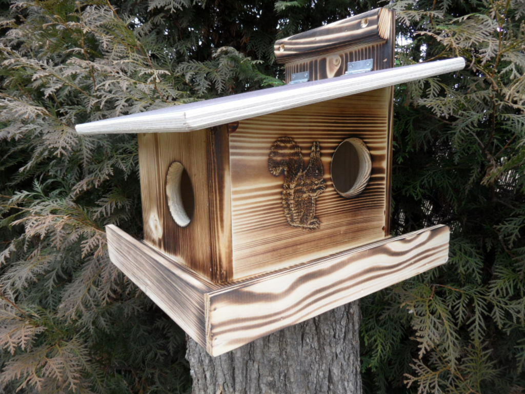 Wie süß ist denn dieser Eichhörnchenkobel! Das 'Tallinn' Modell ist perfekt für deinen Garten. Mit 3 Eingängen (je 6cm Durchmesser) - die Eichhörnchen haben immer Fluchtmöglichkeiten. Maße 31x26x33cm, Gewicht 3kg - also handlich aber stabil. Aus Fichten- und Kiefernholz, teilweise FSC-zertifiziert - also nachhaltig. Das abnehmbare Dach macht die Reinigung super einfach - nach jedem Winter schnell sauber gemacht. In rustikalem Braun und schwarz lasiert - sieht total natürlich aus. Handgefertigt in Europa - Qualität die man sieht. Einfach hoch im Baum am Stamm aufhängen und den Eichhörnchen ein sicheres Zuhause bieten. Fördern die heimische Tierwelt und sieht auch noch toll aus!