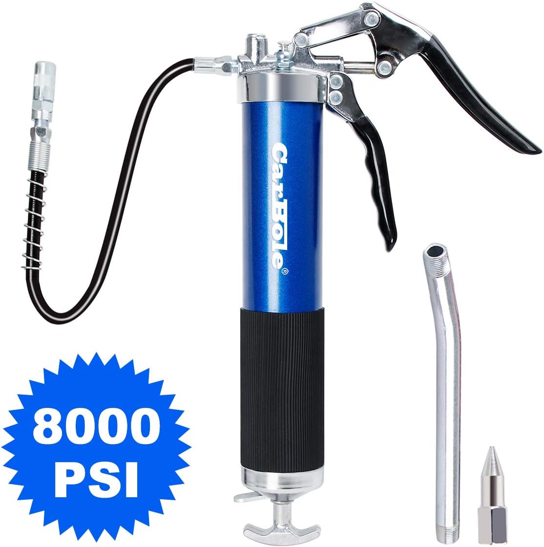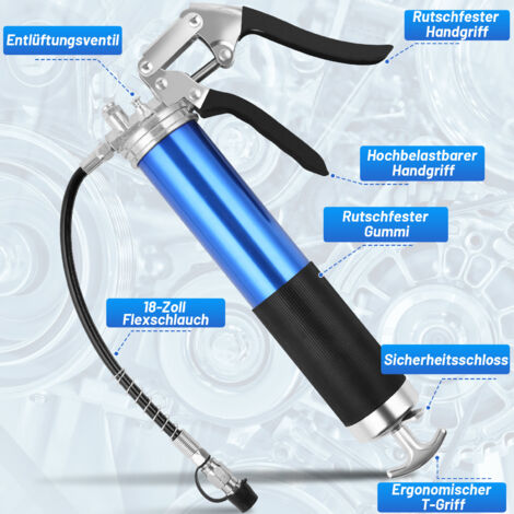 Für alle, die regelmäßig schmieren müssen: Diese Einhand-Fettpresse mit praktischem Pistolengriff macht das Leben leichter! Mit satten 8000 PSI (550 bar) Druck bringst du auch hartnäckiges Fett genau dahin, wo es hin soll. Der verstärkte Feder und O-Ring versiegelte Pumpkopf verhindern lästiges Auslaufen - das Fett kommt da raus, wo es soll! Besonders clever: Das Entlüftungsventil entfernt mit einem Knopfdruck lästige Lufteinschlüsse. Der ergonomische Anti-Rutsch-Griff liegt super in der Hand und der Pistolengriff gibt dir perfekte Hebelwirkung. Aus eloxiertem Aluminium ist die Presse robust aber trotzdem leicht - kein mühsames Schleppen mehr! Kompatibel mit Standard 400ml Fettkartuschen, aber du kannst sie auch mit losem Fett befüllen. Im Lieferumfang sind gleich drei Aufsätze dabei: 30cm Flexschlauch, gerades Metallrohr und Fettanschlusskupplung - für jeden Einsatzzweck die richtige Lösung. Ob Auto, Baustelle, Landwirtschaft oder Industrie - mit dieser Fettpresse bist du bestens ausgestattet. Einfach Kartusche rein, aufsetzen und los geht's!