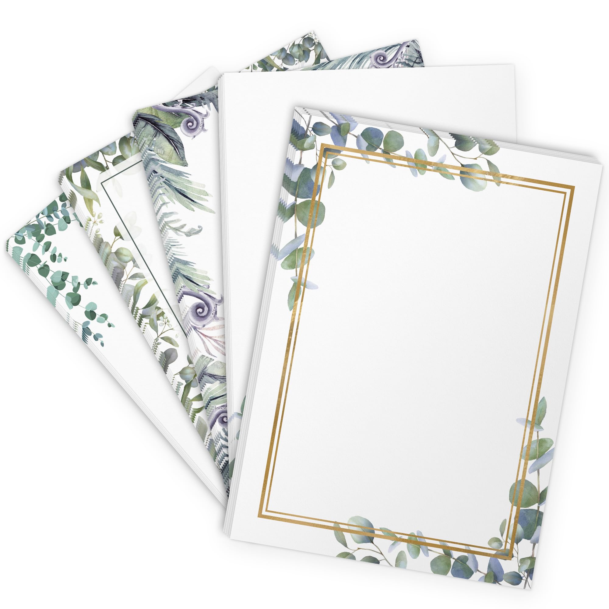Für alle, die es persönlich und stilvoll lieben! Dieses wunderschöne Briefpapier-Set der Einladungskarten Manufaktur Hamburg bringt Eleganz in deine Korrespondenz. 50 Blatt im DIN A4 Format mit 5 verschiedenen floralen Motiven in Eukalyptus-Optik und dezenten Gold-Akzenten. Jedes Blatt ist beidseitig bedruckt - das macht echtes Qualitätspapier aus! Mit 90g/m² ist es weder zu dünn noch zu dick, perfekt für Tintenstrahl- und Laserdrucker. Ob Geschäftsbriefe, kreative Lebensläufe, Einladungen, Speisekarten oder Menükarten für die Hochzeit - die Möglichkeiten sind endlos. Die Blätter lassen sich beschreiben, bemalen und bedrucken. Geliefert in einer wiederverschließbaren Hülle, praktisch für die Aufbewahrung. Ein kleines Unternehmen aus Deutschland, das Wert auf Qualität und Kundenzufriedenheit legt. Mach deine Briefe zu etwas Besonderem - mit diesem traumhaften Papier-Set!