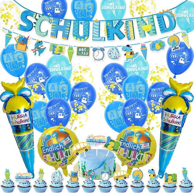 Mach den ersten Schultag deines Kindes zu einem unvergesslichen Erlebnis! Dieses komplett Einschulungs-Deko-Set in blau ist perfekt für Jungen und sorgt für eine fröhliche, festliche Atmosphäre. Enthalten ist alles was du für die perfekte Einschulungsparty brauchst: ein SCHULKIND Banner, eine coole Dinosaurier-Girlande, 2 blaue Zuckertüten-Folienballons, 20 SCHULKIND ABC 123 Ballons, 2 runde 'Endlich SCHULKIND' Folienballons, 12 Tortendeko-Elemente und das gesamte Zubehör wie Bänder und Aufhängeband. Die Ballons bestehen aus hochwertiger Aluminiumfolie und langlebigem Latex - ungiftig und wiederverwendbar. Besonders süß: Die Paillettenballons sind mit blauen Pailletten gefüllt - wenn die Party vorbei ist, können die Kinder die Ballons platzen lassen und genießen einen lustigen Paillettenregen! Einfach mit 80-90% Luft oder Helium befüllen und dekorieren. Das Banner aus umweltfreundlichem Papier komplettiert das fröhliche Gesamtbild. Schaffe unvergessliche Erinnerungen an diesen besonderen Tag - denn die Einschulung kommt nur einmal im Leben!