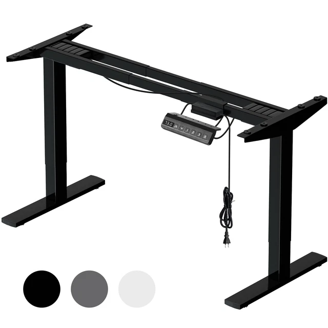 Endlich gesundes Arbeiten im Stehen und Sitzen! Dieses elektrische Tischgestell lässt sich super einfach von 64-129cm Höhe verstellen. Mit zwei starken Motoren hebt es bis zu 120kg sanft und leise (unter 45dB). Die 4 Memory-Tasten merken sich deine Lieblingshöhen - ein Knopfdruck und der Tisch stellt sich automatisch ein. Der Rahmen ist von 107,5-180cm breite verstellbar und passt zu den meisten Tischplatten. Mit Kollisionsschutz - stoppt sofort wenn etwas im Weg ist. Aus robustem, pulverbeschichtetem Stahl für lange Haltbarkeit. Perfekt fürs Homeoffice oder Büro. 5 Jahre Garantie auf den Rahmen, 2 Jahre auf die Elektronik. Wechsle einfach zwischen Stehen und Sitzen und tue etwas Gutes für deinen Rücken. Einfache Montage und sofort einsatzbereit!