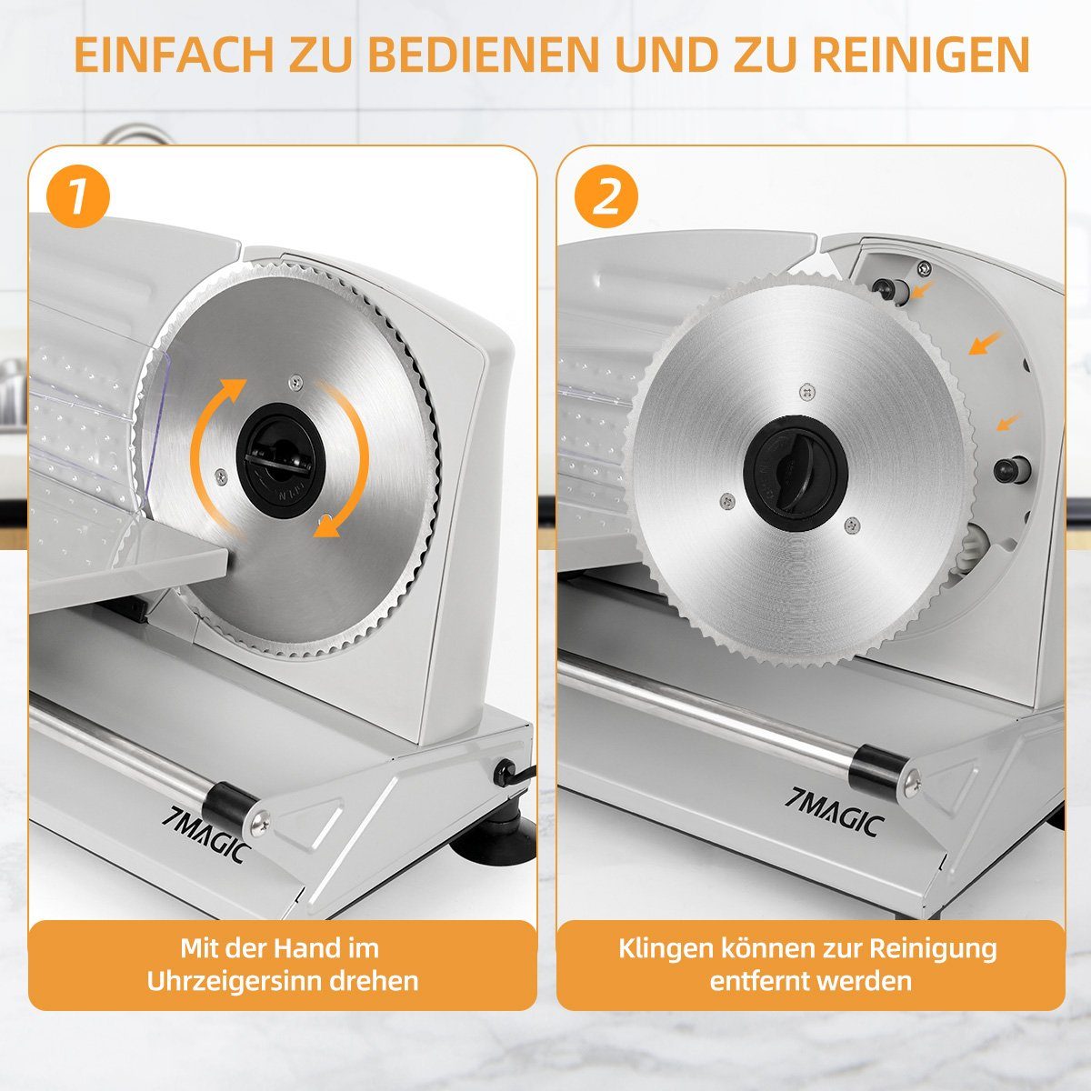 Schluss mit mühsamem Schneiden von Hand! Dieser elektrische Allesschneider von FOHERE macht's dir super einfach. Mit stolzen 250 Watt Leistung schneidet er alles mühelos durch - ob Brot, Wurst, Käse oder Fleisch. Das Tolle: Du bekommst gleich drei verschiedene Edelstahl-Klingen mit - zwei gezackte und eine glatte. So hast du für jedes Lebensmittel die richtige Klinge parat! Die Schnittdicke kannst du von 0 bis 15 mm einstellen - perfekt für dünne Aufschnittscheiben oder dickere Brotscheiben. Mit dem praktischen Tablett fängt du alles sauber auf. Reinigen ist auch kein Problem - die Schneideplattform ist einfach abnehmbar. Und das Beste: Die Sicherheitsverriegelung schützt vor versehentlichem Anlaufen - super wichtig in Haushalten mit Kindern! Ob fürs Frühstücksbrötchen, das Abendbrot oder die Party - dieser Allesschneider ist dein bester Helfer in der Küche. Spart Zeit und Nerven - und die Scheiben werden viel gleichmäßiger als von Hand! Ein echter Game-Changer für jeden, der gerne kocht und viel schneidet. Probier's aus - du wirst dich fragen, wie du je ohne ausgekommen bist!