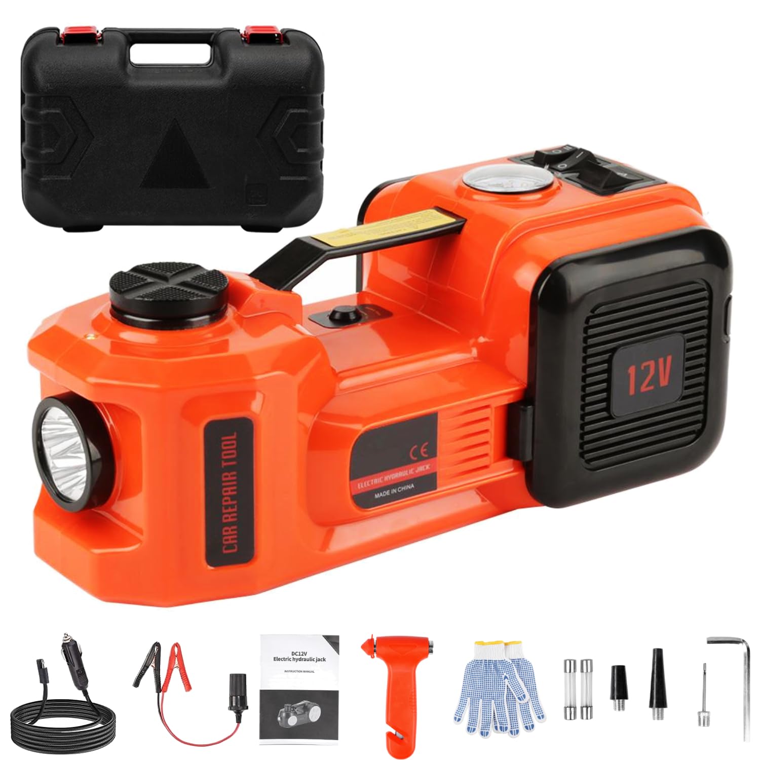 Schluss mit anstrengendem Wagenheben! Der VOBOR Elektrische Wagenheber macht Reifenwechsel und Reparaturen zum Kinderspiel. Mit satten 5 Tonnen Hebekraft meistert er problemlos Autos, SUVs, Limousinen und sogar leichte LKWs. Innerhalb von nur einer Minute hast du dein Fahrzeug auf die maximale Höhe von 150-450 mm gebracht - und das komplett automatisch! Der Heber stoppt sicher, sobald die Maximalhöhe erreicht ist. Das geniale Feature: Die integrierte Luftpumpe füllt deine Reifen blitzschnell auf. In den seitlichen Werkzeugkästen findest du alle nötigen Luftschläuche und Aufsätze. Das stabile Kreuzdesign des Stützkopfes sorgt für sicheren Halt und das verbesserte hydraulische System verhindert Ölverluste. Selbst nachts kein Problem - die LED-Beleuchtung macht alles gut sichtbar. Betrieben wird der Wagenheber einfach über den 12V Zigarettenanzünder oder direkt an der Autobatterie. Mitgeliefert werden zwei Ersatzsicherungen, sodass du für alle Fälle gewappnet bist. Ob Pannenhilfe unterwegs oder Reparaturen in der heimischen Garage - dieses Teil ist ein echter Game Changer! Einfach anschließen, Knopf drücken und entspannt zurücklehnen.