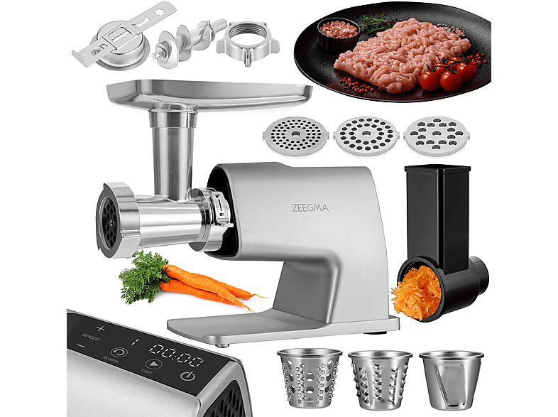Küchenprofi für zuhause! Der ZEEGMA Molen Master ist ein absolutes Kraftpaket mit 2500 Watt Spitzenleistung. Ob Würste, Hackfleisch oder Kebbe - diese Maschine meistert alles mit Leichtigkeit. Und das moderne Touch-Display macht die Bedienung super einfach.\n\nTechnische Highlights:\n• 2500W Maximalleistung\n• 2,5kg/Minute Durchsatzleistung\n• 6 Geschwindigkeitsstufen\n• Rückwärtsgang gegen Verstopfungen\n• LED-Touchscreen mit Timer\n\nIm Lieferumfang ist alles dabei, was das Köhlerherz begehrt:\n• 3 Edelstahl-Lochscheiben (3/5/8mm)\n• Wurstfüller und Kebbe-Aufsatz\n• Gemüseschneider mit 3 Trommeln\n• Praktischer Zubehörbehälter\n\nDas Vollmetall-Gehäuse ist nicht nur robust, sondern sieht auch richtig edel aus. Die Saugnäpfe an der Unterseite sorgen für sicheren Stand während der Arbeit. Und wenn mal was feststeckt, einfach den Rückwärtsgang aktivieren - problem solved!\n\nPerfekt für alle, die Wert auf Qualität und Leistung in der Küche legen. Vom Wochenendeinkauf verarbeiten bis zur Partyvorbereitung - mit diesem Fleischwolf machst du alles schneller und einfacher!