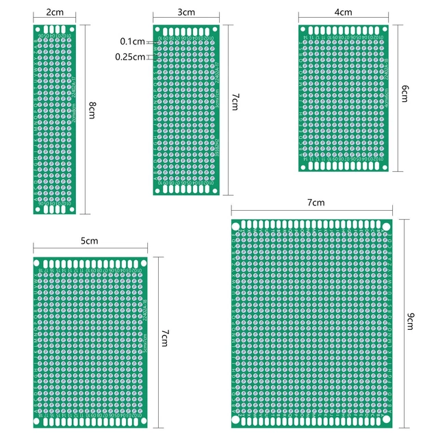 Entdecke die Welt der Elektronik! Dieses umfangreiche PCB-Board-Set gibt dir alles, was du für deine DIY-Projekte brauchst - ob Arduino-Basteleien, Roboter-Bau oder eigene Schaltungen. Mit 12 doppelseitigen Platinen in 6 verschiedenen Größen bist du für jedes Projekt gewappnet.\\n\\nIm Lieferumfang findest du alles, was das Elektroniker-Herz begehrt: Stiftleisten (männlich, weiblich, rechtwinklig), Klemmenblöcke, Steckbrücken und sogar IC-Sockel in verschiedenen Größen. Alle Komponenten haben den Standard-Pinabstand von 2,54 mm und sind somit kompatibel mit den meisten Elektronik-Bauteilen.\\n\\nDie vorverzinnten Löcher machen das Löten super einfach - perfekt für Einsteiger und Fortgeschrittene. Die vier Befestigungslöcher an den Ecken jeder Platine ermöglichen eine stabile Montage. Deine Kreativität kennt mit diesem Set keine Grenzen - vom einfachen Blinklicht bis zur komplexen Steuerung!