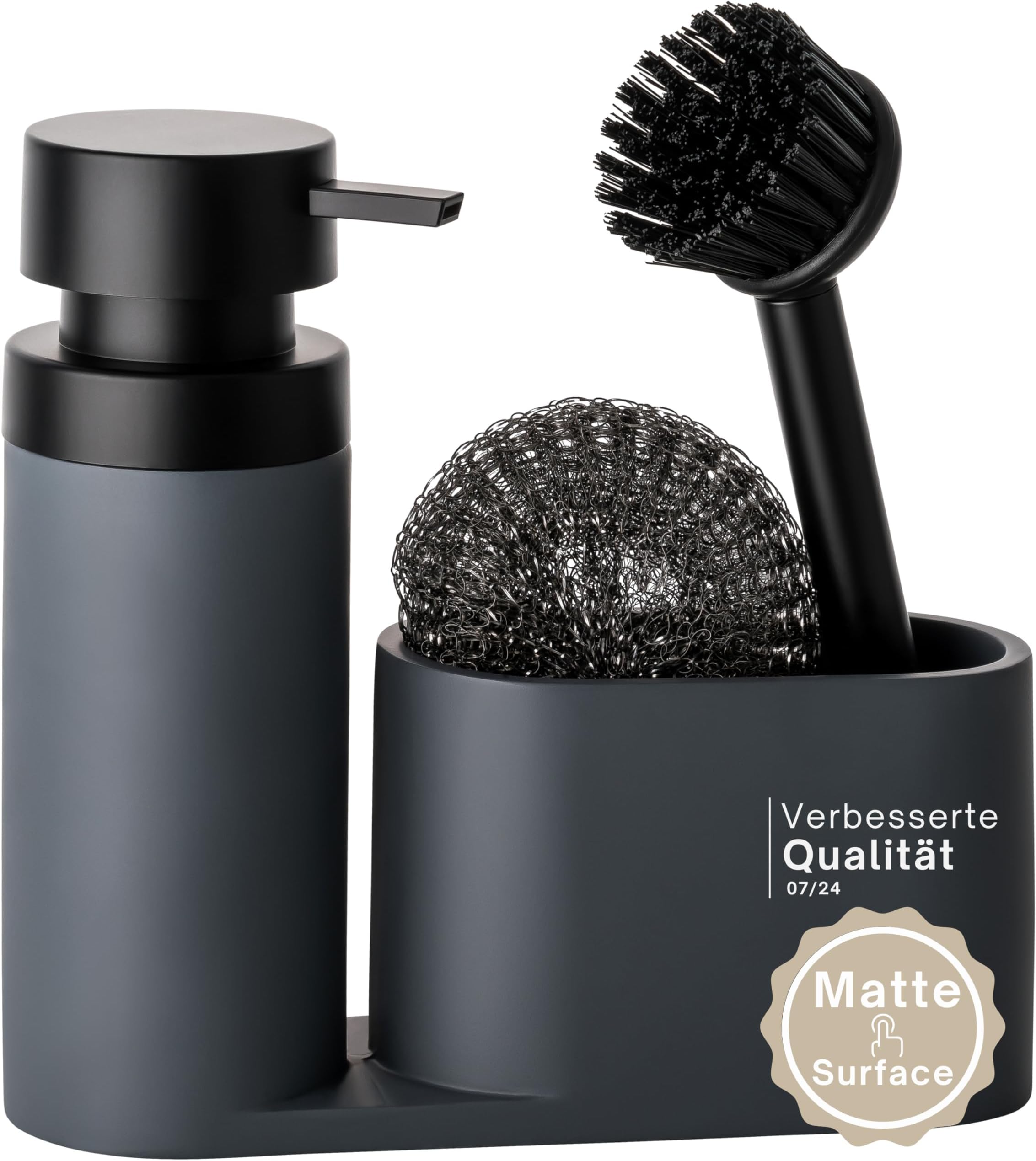 Wow, dieser eluno Spülbecken Organizer bringt endlich Ordnung in deine Küche! Das komplette Set in schickem Schwarz inklusive Seifenspender (350ml), Spülbürste mit wechselbarem Kopf und schwenkbarem Spültuchhalter. Die Soft-Touch Oberfläche fühlt sich super hochwertig an und die vier Silikonpads verhindern lästiges Verrutschen. Mit den Maßen 22x21x6,5 cm passt er perfekt in jede Spüle und bietet sogar noch Platz für einen zusätzlichen Schwamm. Der Spender kann sowohl für Spülmittel als auch Handseife verwendet werden - super praktisch! Im Lieferumfang sind sogar Ersatzteile für Bürstenkopf und Pumpe enthalten. Einfach hinstellen und schon hast du alle Spülutensilien griffbereit und ordentlich verstaut. Mach deine Küchenarbeit effizienter und deine Spüle zum organisierten Highlight!