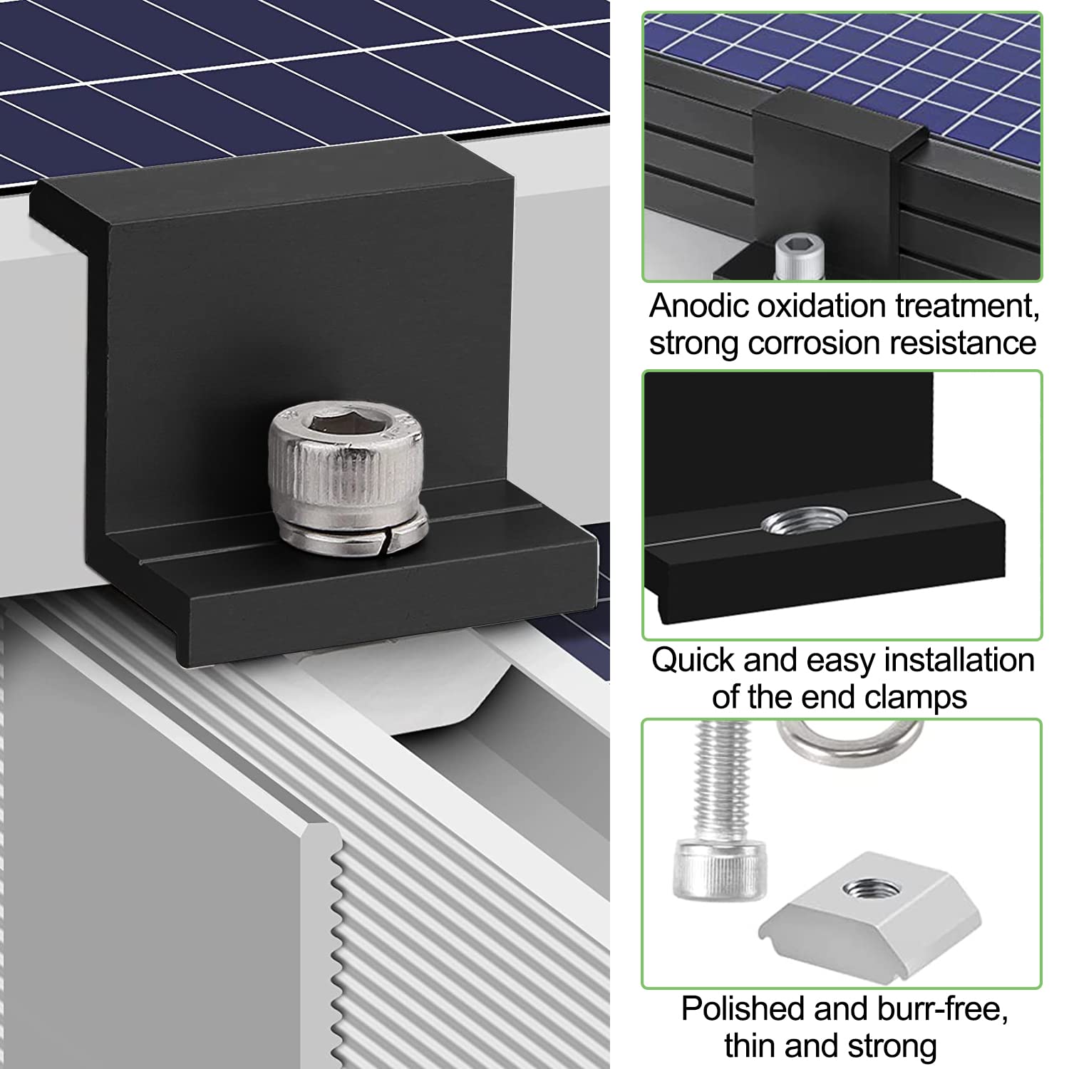 Du willst deine Solarpanels sicher befestigen? Mit diesen 12 Aluminium-Endklemmen wird die Montage zum Kinderspiel! Jede Klemme wiegt nur 45g, ist aber super stabil und hält deine Solarmodule sicher an Ort und Stelle. Das Z-förmige Design macht die Installation besonders einfach - kein Profi-Werkzeug nötig! Die Klemmen haben vorgebohrte Löcher und werden inklusive Muttern und Schrauben geliefert. Perfekt für Flachdächer, Wohnmobile, Yachten oder Gartenhäuser. Aus hochwertigem Aluminium gefertigt, rosten sie nicht und halten auch bei schlechtem Wetter stand. Mit 3,8x3,5x3cm Größe passen sie zu den meisten Standard-Solarpaneelen. Mach deine Solarinstallation stressfrei und sicher mit diesen praktischen Halterungen!
