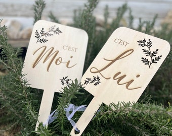 Suchst du eine lustige Aktivität für deine Hochzeit? Dieses 'Sie & Er' Spiel bringt garantiert Stimmung in die Feier! Das Set enthält 2 Holzschilder (14x22cm) mit 'Ich/Sie' und 'Ich/Er' Aufdruck, plus 8 Karten mit insgesamt 80 verschiedenen Fragen. Braut und Bräutigam halten die Schilder hoch und beantworten die unterhaltsamen Fragen - die Gäste werden lieben, zu sehen, wie gut sich das Paar wirklich kennt! Die Massivholz-Schilder sind hochwertig verarbeitet, die Karten aus dickem Karton. Einfach zu spielen, sorgt für lustige Momente und unvergessliche Erinnerungen. Perfekt als Geschenk für das Brautpaar oder zur eigenen Hochzeitsplanung. Mach deine Hochzeit zu einem unvergesslichen Erlebnis mit diesem charmanten Spiel - Lachen und Freude garantiert!