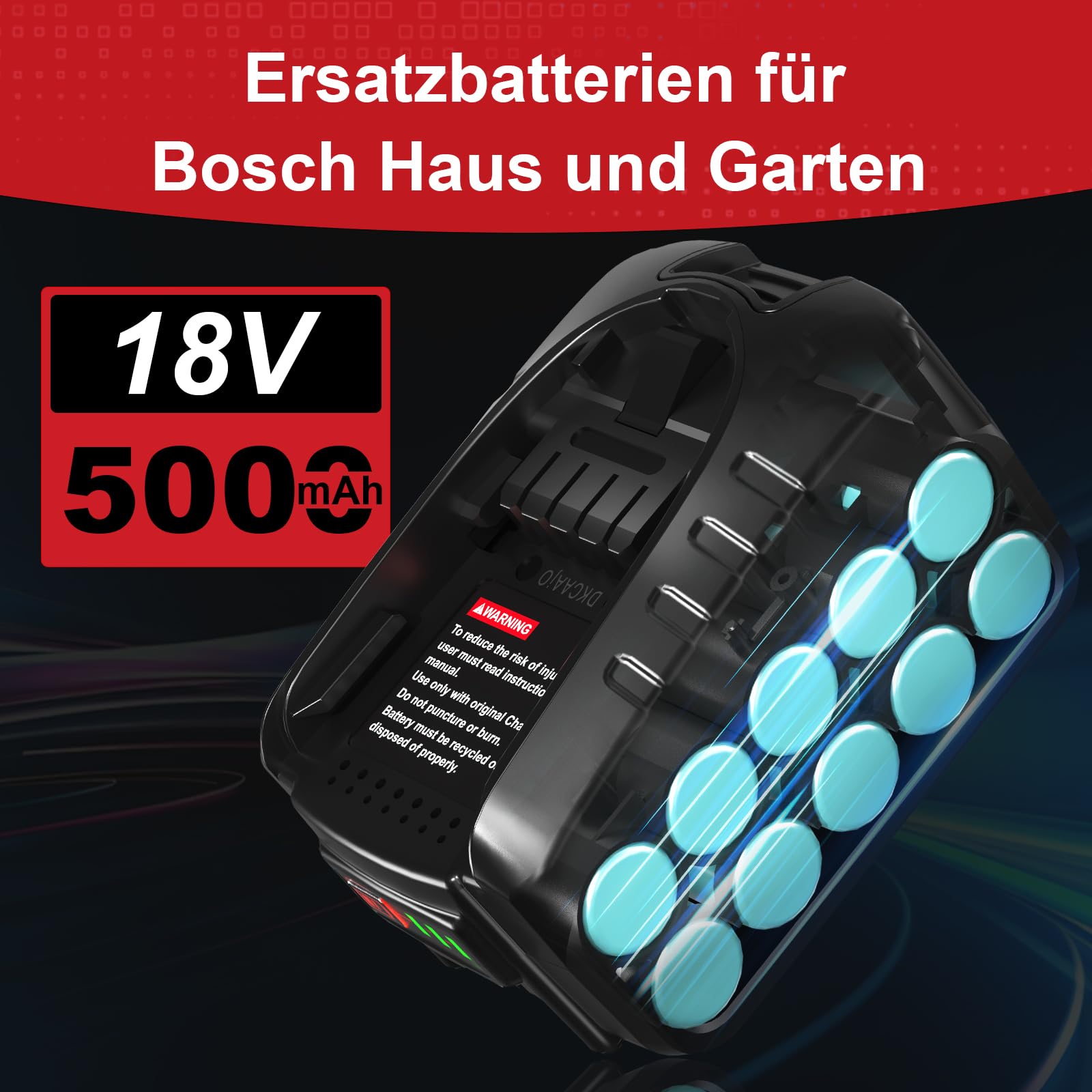 Nie wieder Stromausfall bei der Arbeit! Dieser hochwertige 18V Ersatzakku mit 5.0Ah Kapazität gibt deinen Bosch-Geräten neue Power. Perfekt für anspruchsvolle Heim- und Gartenarbeiten - ob Akkuschrauber, Heckenschere oder Laubbläser.