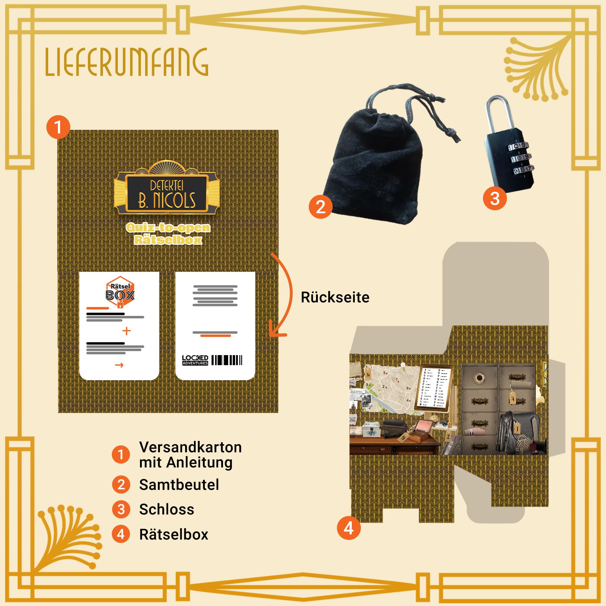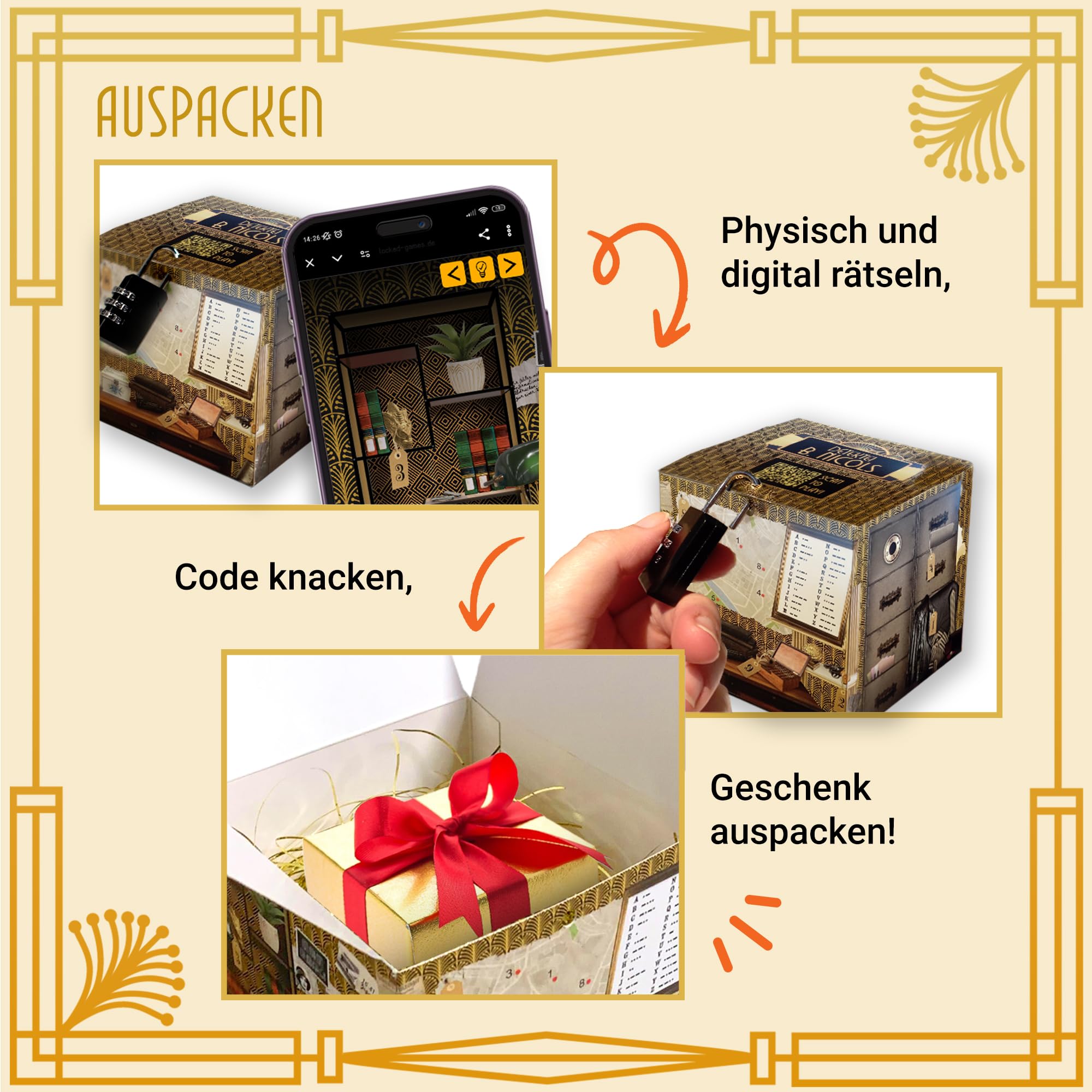 Die Beschenkten scannen einen QR-Code und kombinieren digitale Hinweise mit den Infos auf der Box. Drei knifflige Rätsel müssen gelöst werden um an das Geschenk zu kommen. Falls's mal zu schwer wird, gibt's online Hilfestellungen.