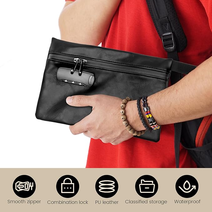 Perfekt für unterwegs! Diese geruchsdichte Tasche schützt deine wichtigen Dokumente und Gegenstände vor unangenehmen Gerüchen, Wasser und Staub. Aus hochwertigem PU-Leder gefertigt, ist sie robust und langlebig. Mit praktischem Zahlenschloss - einfach Code einstellen und deine Sachen sind diebstahlsicher verstaut. Der leichtgängige Reißverschluss lässt sich super einfach öffnen und schließen, die verstärkten Griffe sorgen für sicheren Halt. Innen findest du praktische Fächer, um alles ordentlich zu sortieren - Pässe, Tickets, Bargeld, alles hat seinen Platz. Maße: 24,5x16,5x3 cm, ideal für die Handtasche oder den Rucksack. Ob Geschäftsreise, Urlaub oder täglicher Gebrauch - mit dieser Tasche hast du deine wichtigen Dokumente immer sicher dabei. Verfügbar in Schwarz, Rosa, Grau und Grün - such dir deine Lieblingsfarbe aus!