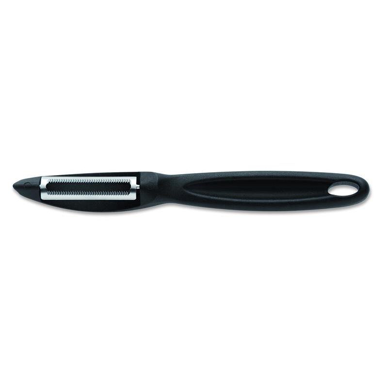 Schälen war noch nie so einfach! Der F. DICK Allzweckschäler mit seiner speziellen Klinge mit Zackenschliff meistert selbst die härtesten Schalen mühelos. Ob Kartoffeln, Karotten oder sogar Kiwis - dieser Schäler gleitet perfekt durch jedes Obst und Gemüse. Die 18cm lange Klinge aus robustem Edelstahl garantiert lange Freude am Schälen. Der ergonomische schwarze Kunststoffgriff liegt angenehm in der Hand, sodass auch langes Schälen nicht anstrengend wird. Besonders praktisch: Das Loch am Griffende ermöglicht eine platzsparende Aufbewahrung an deiner Küchenleiste. So hast du den Schäler immer griffbereit, wenn du ihn brauchst. Ein qualitativ hochwertiges Küchenwerkzeug, das sich in jeder Küche bewährt. Einfach besser schälen!