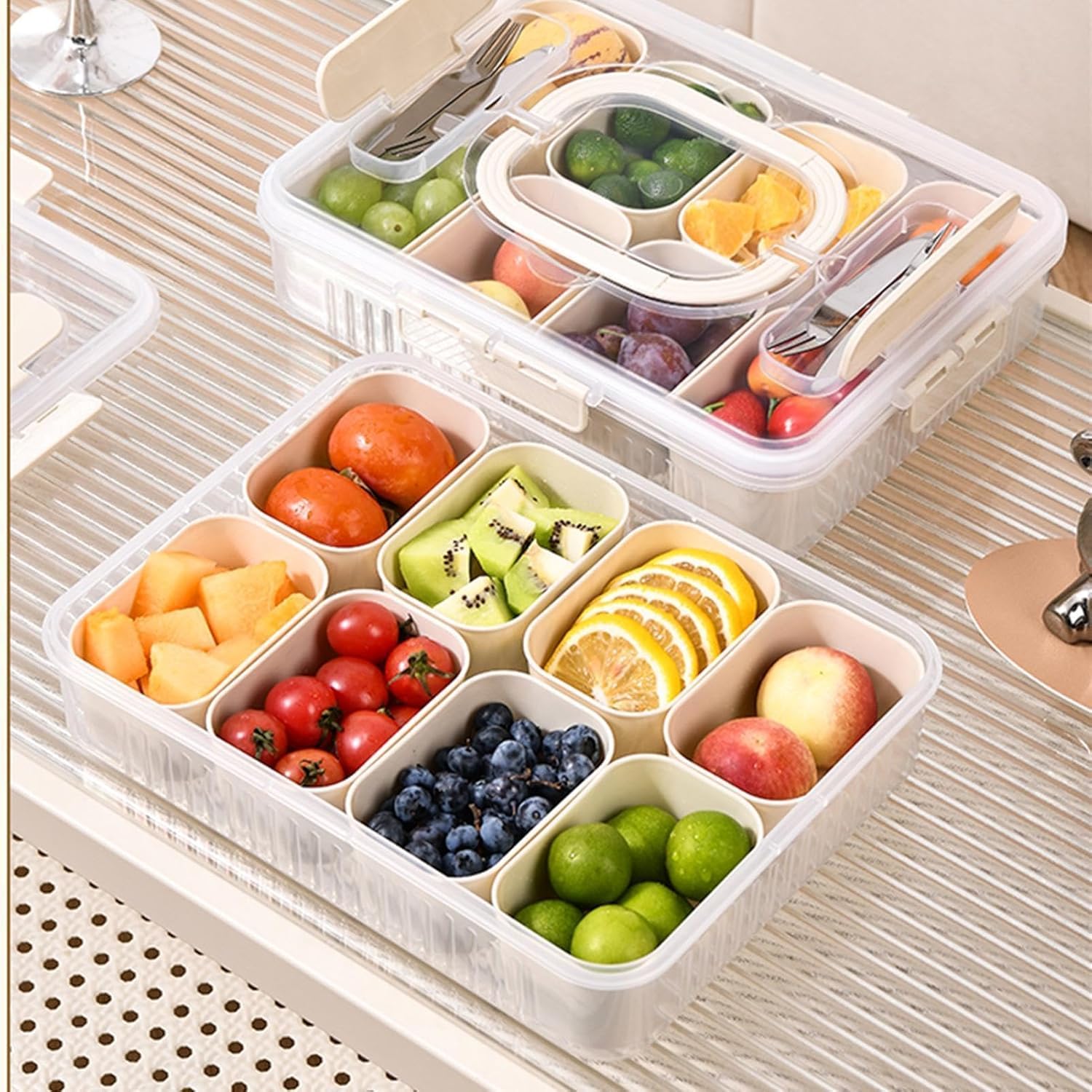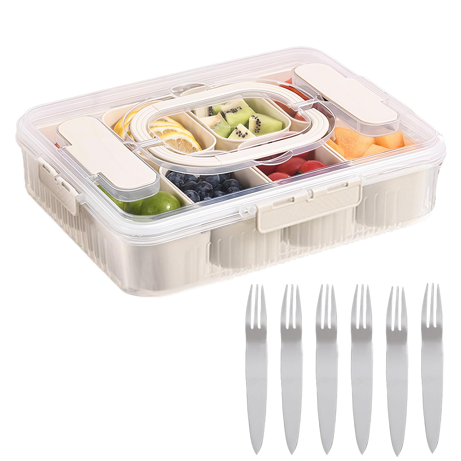 Perfekte Ordnung für Deine Snacks! Diese praktische Snackbox mit 8 separaten Fächern hält alles schön getrennt - keine Geschmacksvermischungen mehr! Aus sicherem, BPA-freiem Kunststoff ist sie lebensmittelecht und geruchsneutral. Der Temperaturbereich von -20°C bis 130°C macht sie kühlschrankgeeignet. Mit dabei: 6 hochwertige Edelstahl-Gabeln, die sicher in den integrierten Besteckfächern verstaut werden. Der transparente Deckel mit 4 Schnallen und Silikondichtung hält alles frisch und verhindert Auslaufen. Der stabile Griff macht das Tragen supereinfach. Ideal für Picknicks, Büro, Schule, Reisen oder einfach zur Lebensmittelaufbewahrung daheim. Ob Nüsse, Obst, Gemüse oder Desserts - mit dieser Box wird Snacken zum organisierten Vergnügen! Nicht für Spülmaschine oder Mikrowelle geeignet.