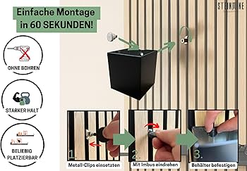 Endlich Ordnung an deiner Akustikwand! Dieser stylische Metallkorb lässt sich ganz einfach ohne Bohren befestigen - einfach einhaken, einrasten und fertig. In nur 60 Sekunden hast du eine stabile Ablage für alles Mögliche: Gewürze in der Küche, Handtücher im Bad, Deko im Wohnzimmer oder Büro-Utensilien.\\n\\nEs gibt zwei Größen: Die kleinere Variante misst 15,5 x 10 x 8 cm, perfekt für Kleinigkeiten. Die größere Version mit 24 x 15 x 8 cm bietet mehr Platz. Anders als viele Billiglösungen setzen wir auf echte Metallverschraubungen statt 3D-Druck-Teile - das garantiert maximale Stabilität und Langlebigkeit.\\n\\nDie schwarze Pulverbeschichtung sieht nicht nur super aus, sondern ist auch robust. Das skandinavisch inspirierte Design passt zu jedem Einrichtungsstil. Und das Beste: Kein Werkzeug nötig, keine Löcher in der Wand, keine Rückstände!\\n\\nPerfekt für alle, die ihre Akustikpaneele mit praktischen Ablagen aufwerten wollen - ob in der Wohnung, im Homeoffice oder im Büro. Bring deine Wand nicht nur zum Klingen, sondern mach sie auch super praktisch!