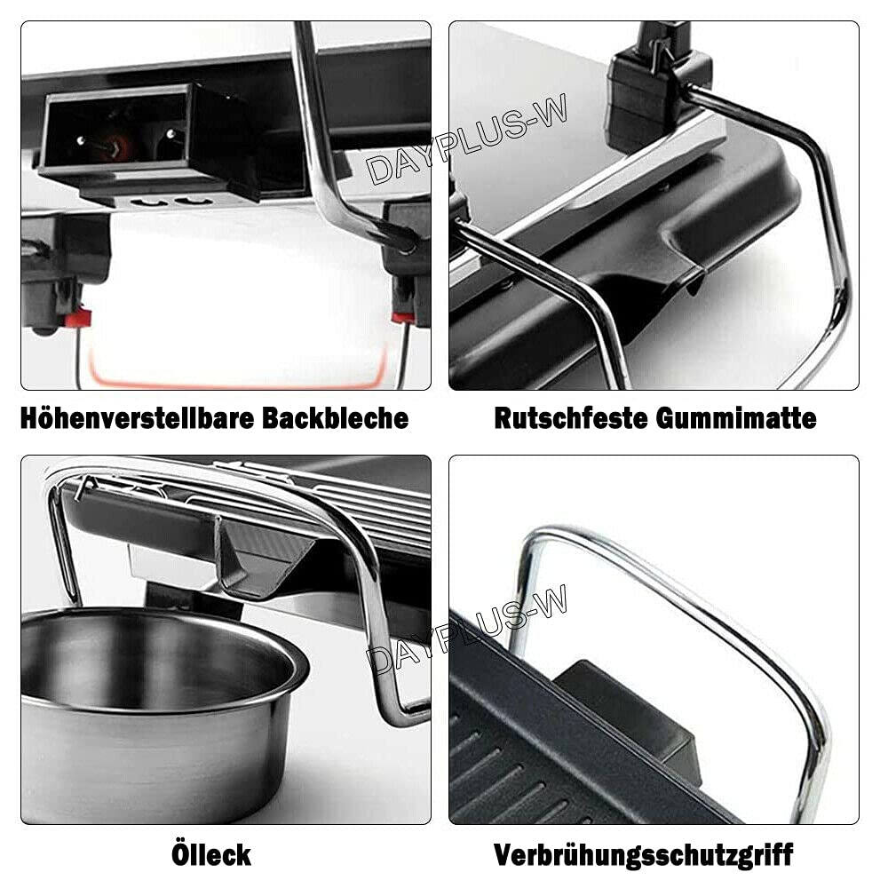 Grillvergnügen ohne Rauch und Ärger! Dieser Elektrogrill mit 1500W Leistung und Antihaftbeschichtung macht Grillen auf dem Balkon oder in der Wohnung zum Kinderspiel. Temperatur von 0-250°C einstellbar, die große Grillfläche (ca. 27x11 cm) bietet Platz für Steaks, Gemüse oder Würstchen. Mit Ölfangtülle und verstellbarer Halterung - überschüssiges Fett wird abgeleitet, für gesünderes Grillen. Die vier Anti-Rutsch-Füße sorgen für Stabilität, die zwei hitzebeständigen Griffe für sicheres Handling. Achtung: Beim ersten Mal kann es etwas rauchen - das ist nur das Schmieröl und verflüchtigt sich schnell. Einfach plug & play - kein Zusammenbau nötig. Perfekt für Partys, Picknicks oder gemütliche Abende auf dem Balkon!