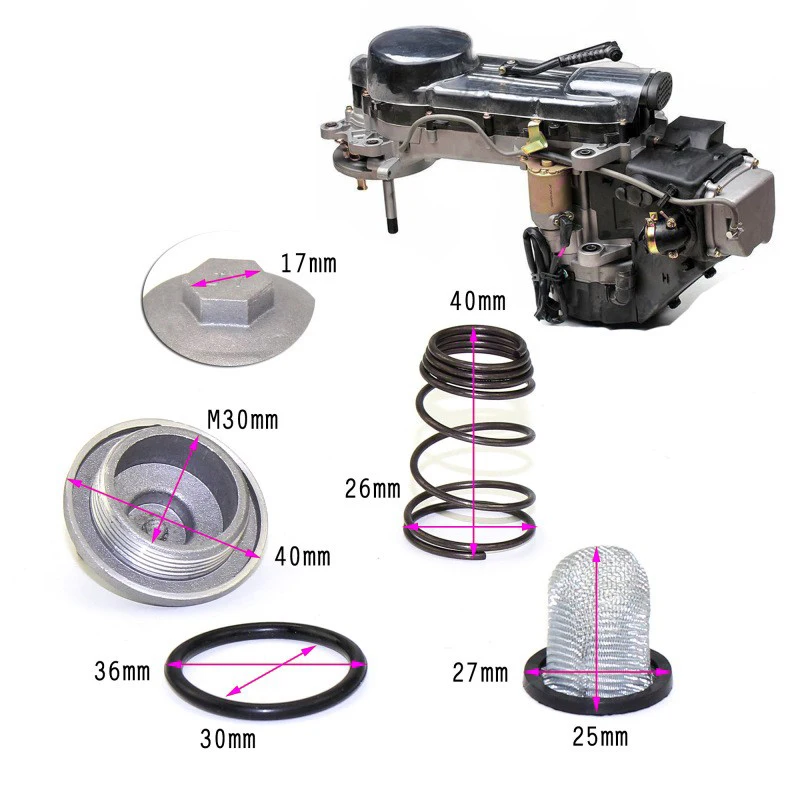 Ölwechsel mal einfach gemacht! Dieses praktische Set enthält alles für den nächsten Ölwechsel an deinem Roller. Perfekt für GY6 Motoren von 50-150ccm - passt zu Baotian, Benzhou, Znen, Taotao und vielen anderen chinesischen Modellen. Enthält: Ablassschraube mit O-Ring, Feder und Ölfilter. Aus Aluminium und Gummi - leicht und korrosionsbeständig. Einfache Installation - kein Herumgefummel mehr! Modellnummer 515502 für die richtige Passform. Welchen Roller fährst du eigentlich? Mit diesem Set machst du den Ölwechsel zum Kinderspiel und sparst Werkstattkosten!