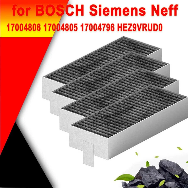 Puh, deine Dunstabzugshaube riecht nicht mehr frisch? Zeit für neue Aktivkohlefilter! Dieses 8er-Set passt für zahlreiche Modelle von Bosch, Siemens, Neff, Gaggenau und Constructa.\n\nDie Filter sind 194 x 75 x 35 mm groß und absorbieren Kochgerüche super effektiv. So bleibt deine Küchenluft immer frisch und angenehm. Einfach alle 4-6 Monate austauschen - je nach Nutzung.\n\nKompatibel mit Bosch HEZ9VRCR0, Siemens HZ9VRCR0, Neff Z821VR0, Gaggenau CA282111 und vielen mehr. Auch für Kochfeld-Modelle wie Bosch PIE895B15E oder Siemens ED877FQ25E geeignet.\n\nDie Montage ist denkbar einfach: Alten Filter raus, neuen rein - fertig! Keine Werkzeuge nötig. Deine Dunstabzugshaube läuft wieder wie neu und entfernt lästige Gerüche zuverlässig.\n\nMit diesen originalen Ersatzfiltern schonst du deine Dunstabzugshaube und verlängerst ihre Lebensdauer. Frische Küchenluft war noch nie so einfach! Einfach bestellen und wieder durchatmen können.