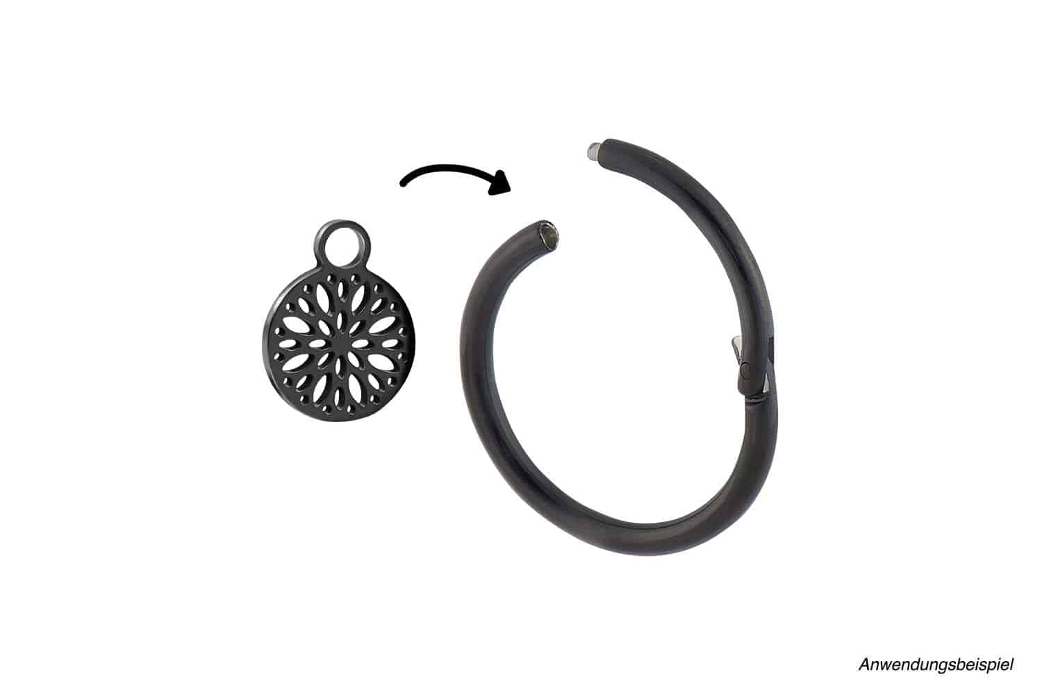 Verpasse deinem Piercing-Style den letzten Schliff! Dieser wunderschöne Mandala-Anhänger aus hautverträglichem Chirurgenstahl 316L verwandelt jeden Clicker-Ring oder jede Creole in ein einzigartiges Schmuckstück. Mit den Maßen 9x11,5mm ist er dezent aber dennoch auffällig genug, um Blicke auf sich zu ziehen. Passt perfekt zu Ringen mit einer Stabstärke von bis zu 2mm - einfach anhängen und dein Piercing wird zum absoluten Hingucker. Die silberfarbene Oberfläche glänzt dezent und das filigrane Mandala-Motiv verleiht deinem Style eine spirituelle Note. Ideal für Helix-, Ohr- oder andere Piercings. Einfach wechseln und immer wieder neue Looks kreieren. Hochwertige Verarbeitung nach EU-Normen garantiert!
