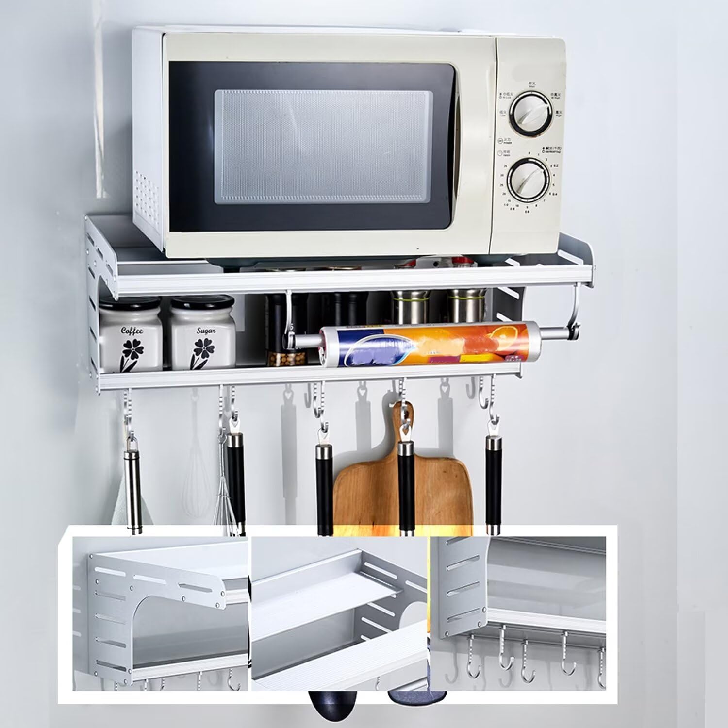 Platzproblem in der Küche? Die MACOJUCHI Wandhalterung ist die Lösung! Endlich mehr Arbeitsfläche und alles schön organisiert. Die Halterung trägt satte 30kg - da kann deine Mikrowelle sicher stehen, ohne zu wackeln. \\n\\nMaße: 53x38x18cm - perfekt für den vertikalen Raum. Und mit den 6 praktischen S-Haken hast du sofort Platz für Kochlöffel, Schneebesen und Co. Alles griffbereit, nichts mehr suchen! \\n\\nDie abgerundeten Ecken sind super durchdacht - keine Kratzer mehr an den Möbeln. Und das kleine Geländer sorgt dafür, dass nichts runterfällt. Sicherheit geht vor! \\n\\nEinfache Montage, robustes Material (0,68mm Stärke!) und mega vielseitig: Nicht nur Küche, auch perfekt für Bad, Büro oder Balkon. Mach deine Küche endlich so, wie du sie immer wolltest - aufgeräumt und functional!