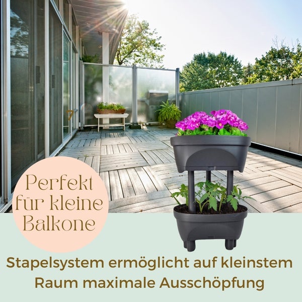 Perfekt für alle, die platzsparend gärtnern wollen! Dieser Terrakotta-Erdbeertopf sieht nicht nur hübsch aus, sondern ist auch super praktisch. Dank der porösen Struktur des Tons bekommen deine Pflanzen genug Luft und es gibt keine Staunässe - ideal für Erdbeeren, Sukkulenten und andere kleine Pflanzen.\\n\\nDas dreistöckige Design lässt dich mehrere Pflanzen gleichzeitig anbauen, ohne viel Platz zu beanspruchen. Das integrierte Tablett fängt überschüssiges Wasser auf und schützt deine Möbel vor Flecken.\\n\\nMaße: Höhe 18,5 cm, Durchmesser 15,5 cm\\nMaterial: Tieftemperatur Keramik Ton\\nGewicht: 630 Gramm\\n\\nEgal ob auf dem Balkon, der Terrasse oder im Garten - dieser Pflanzturm macht überall eine gute Figur und bringt frisches Grün in dein Zuhause. Einfach befüllen, bepflanzen und genießen!