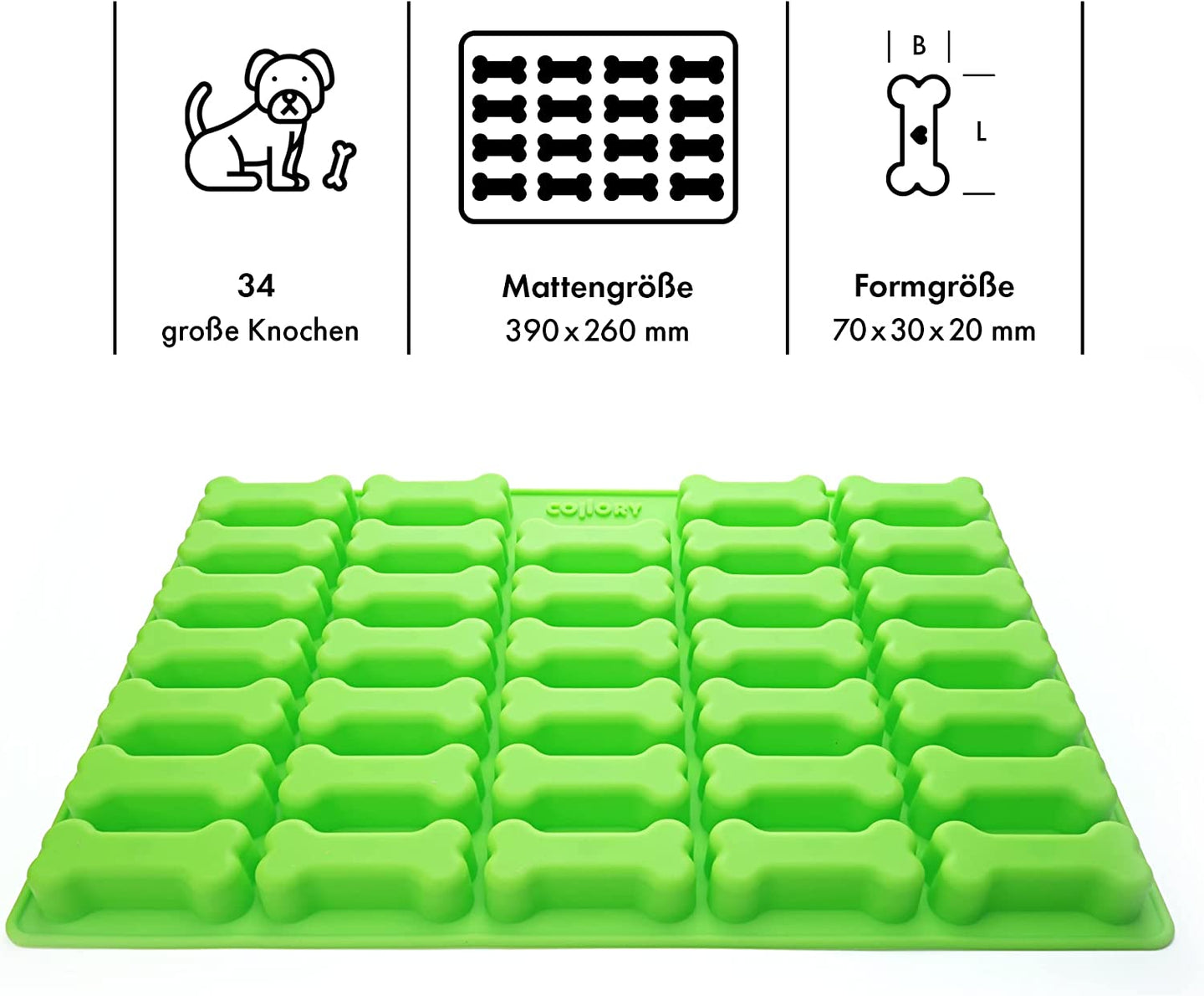 Oh wie süß! Diese SIOUX Backmatte aus Silikon ist perfekt um gesunde Leckerlis für deinen Vierbeiner selbst zu backen. In der Knochenform (2,6cm) passen ganze 154 Leckerlis drauf - ideal für mittelgroße Hunde. Hergestellt in Österreich aus hochwertigem, BPA-freiem Platin-Silikon ist sie absolut sicher für deinen Hund. Die Antihaft-Beschichtung sorgt dafür, dass die Kekse sich super leicht lösen lassen. Mit 385x280mm passt sie auf jedes Standard-Backblech und die Griffmulden machen die Handhabung besonders einfach. Spülmaschinenfest und temperaturbeständig - also wirklich pflegeleicht! Perfekt für Hunde mit Allergien, da du die Zutaten selbst kontrollieren kannst. Ob mit Fleisch, Gemüse oder Getreide - dein Hund wird diese selbstgemachten Leckerlis lieben! Und du sparst dabei noch Geld. Einfach Teig zubereiten, in die Form drücken, backen - fertig!