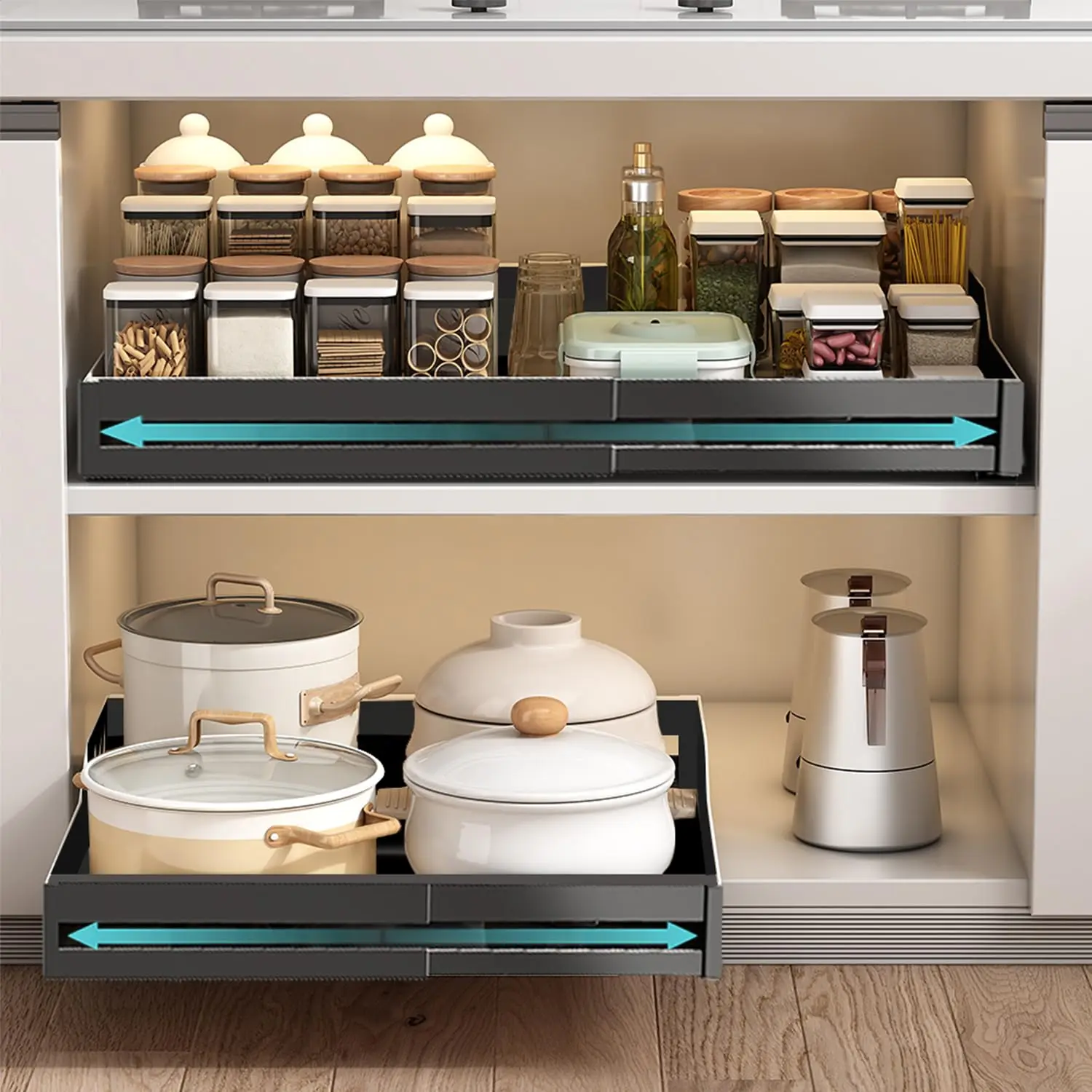 Kennst du das? Deine Küchenschränke sind ein einziges Chaos und hinten siehst du nichts mehr? Diese Teleskop-Schublade ändert alles! Sie lässt sich von 39,5 cm bis 56,5 cm verstellen und passt in die meisten Küchenschränke. Einfach mit dem Klebeband befestigen - kein Bohren nötig! Aus robustem Kohlenstoffstahl, hält bis zu 25 kg aus. Die Schienen laufen super leise und gleitend. Perfekt für Gewürze, Teller, Vorräte oder Putzmittel. Mach aus deinem tiefen Schrank endlich nutzbaren Stauraum! Einfach aufkleben, einräumen und sich über die neue Ordnung freuen. Auch für Bad, Werkstatt oder Speisekammer geeignet.