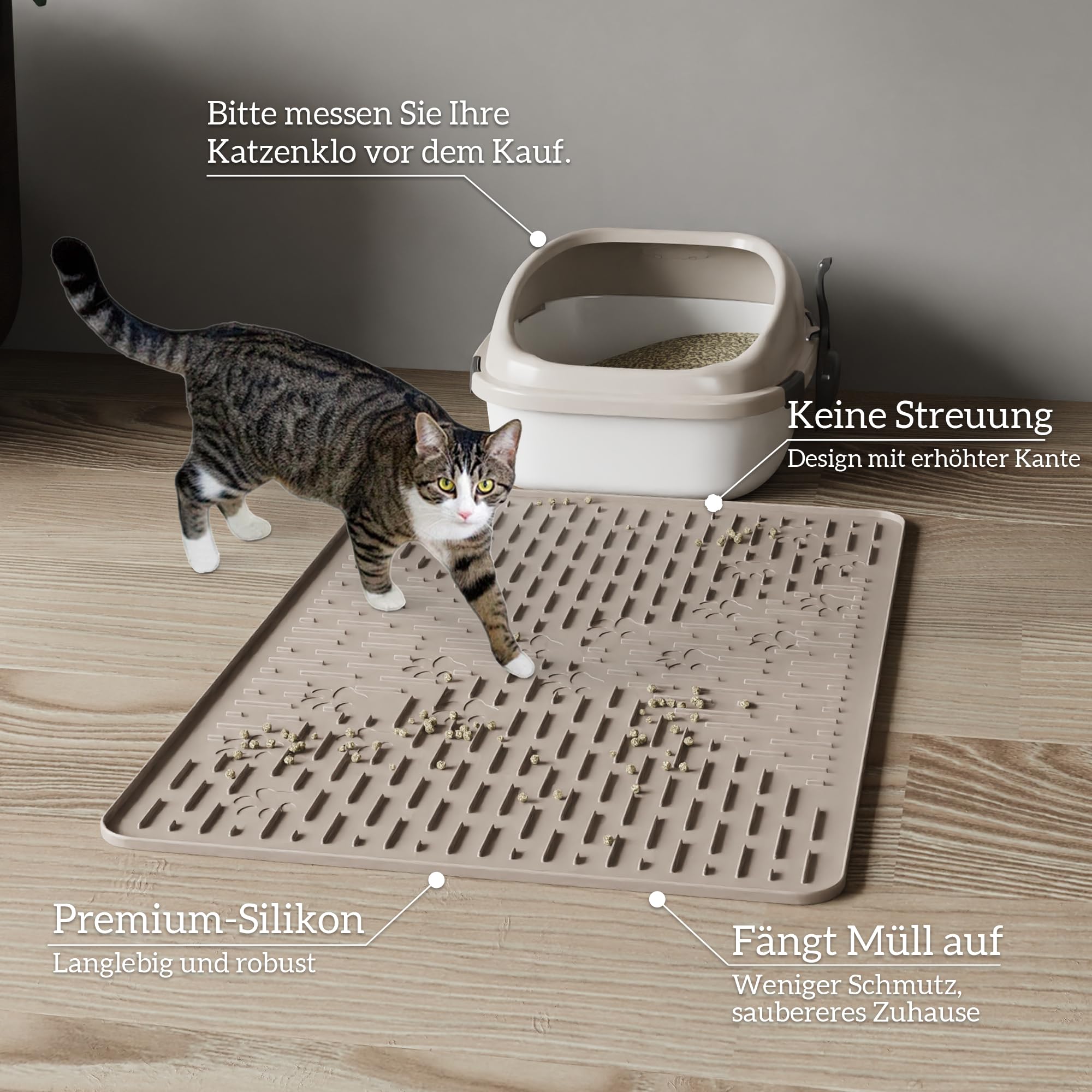 Oh, diese Silikon-Matte für die Katzentoilette ist ja mal die Rettung gegen verstreute Streukrümel! Mit 50x45cm Größe bietet sie reichlich Abdeckung um das Katzenklo. \\n\\nAus hochwertigem Silikon - flexibel, leicht zu reinigen und rutschfest. Verhindert, dass deine Katze Streu in der ganzen Wohnung verteilt. Das elegante graue Design fügt sich dekorativ in jede Wohnung ein. \\n\\nNur 1cm flach - deine Katze hat kein Problem, darauf zu steigen. Und praktisch: Die Matte fängt nicht nur Streu, sondern auch eventuelle Missgeschicke auf. \\n\\nEinfach abzuspülen oder abzuwischen - die Reinigung geht ratzfats. Perfekt für automatische Katzentoiletten oder normale Katzenklos. \\n\\nEin super Geschenk für Katzenbesitzer, die Ordnung um die Katzentoilette lieben. Spart Zeit beim Saubermachen und hält die Umgebung hygienisch. \\n\\nWenn du genug hast vom ständigen Fegen ums Katzenklo - diese Matte ist deine Lösung!