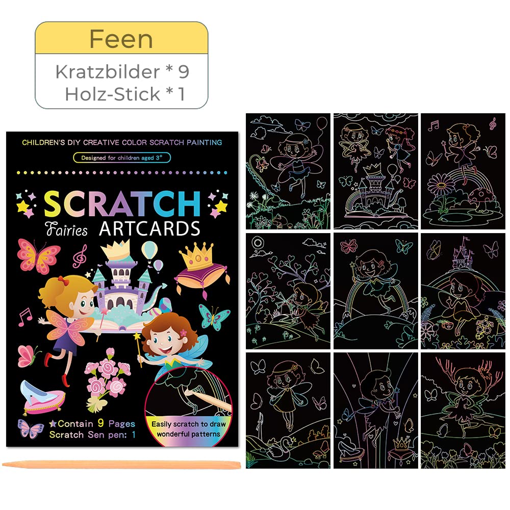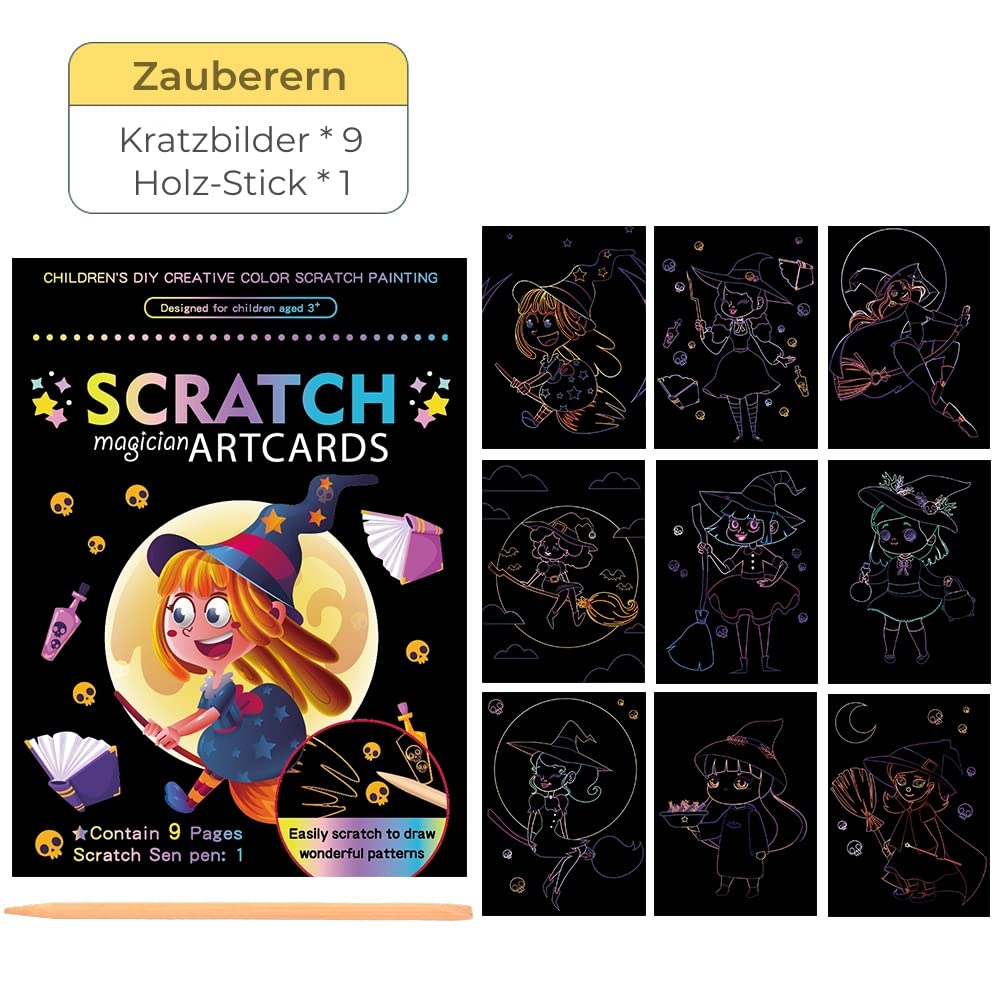Magischer Kratzspaß für kleine Künstler! Dieses Set enthält 9 verschiedene Kratzbilder mit bezaubernden Motiven aus Märchen- und Zauberwelt. Einfach mit den beiliegenden Holzstäbchen die schwarze Schicht abkratzen und bunte Überraschungen entdecken! Jedes Bild misst 14x19 cm und kann nach dem Kratzen auf der Rückseite mit Buntstiften ausgemalt werden. Perfekt für Kinder ab 5 Jahren - fördert Kreativität und Feinmotorik. Ideal für zu Hause, unterwegs oder als Geschenk zu Geburtstagen, Weihnachten und Ostern. Achtung: Das abgekratzte Schwarzpulver kann kleben, also am besten sofort wegwischen damit die Kleidung sauber bleibt!