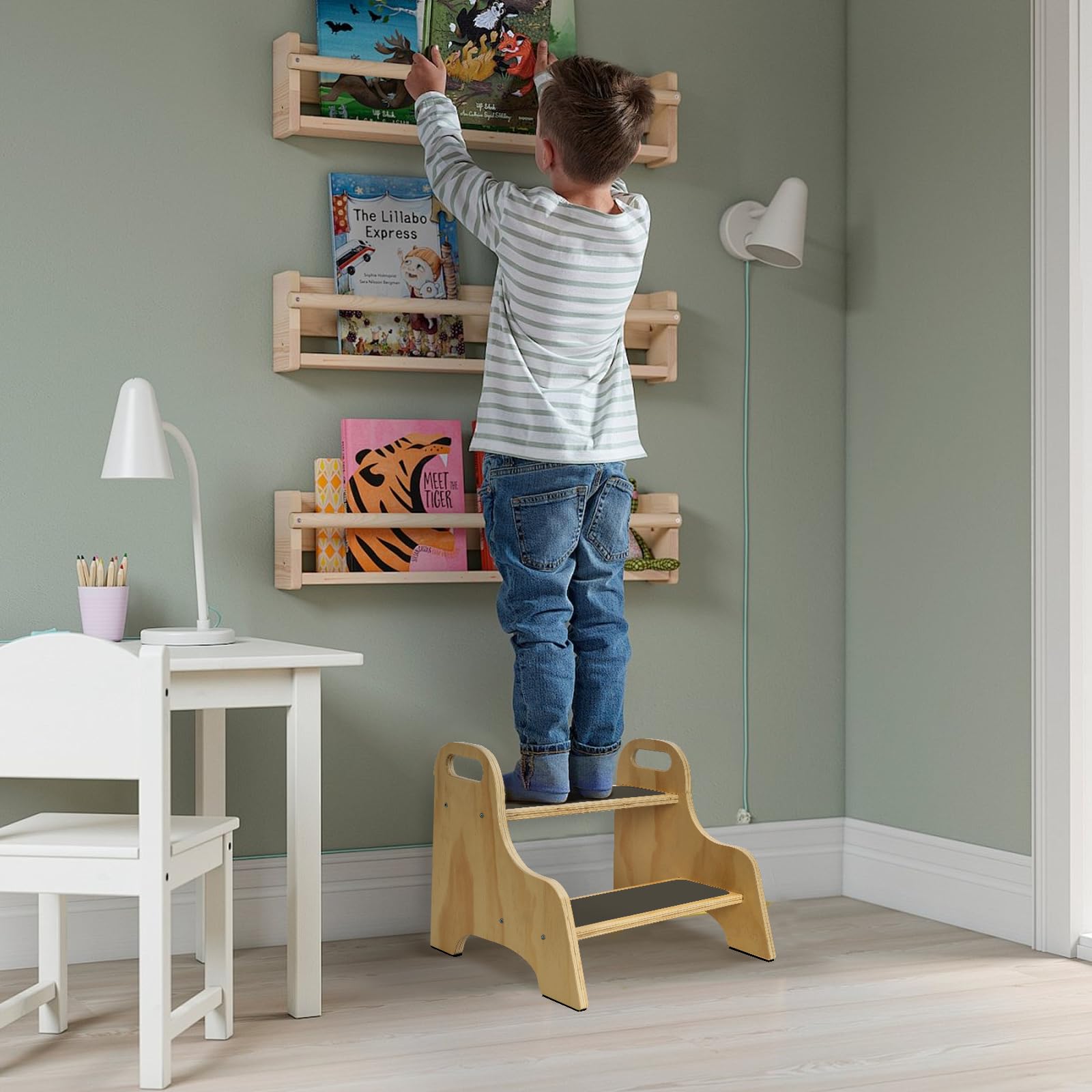 So werden Kinder selbstständig! Dieser praktische 2-stufige Tritthocker aus Holz hilft deinem Kind, überall hinzureichen. Ob zum Händewaschen, Zähneputzen oder in der Küche - jetzt klappt alles alleine. Mit Antirutschmatte für extra Sicherheit und seitlichen Griffen zum leichten Tragen. Hält bis zu 90kg - da können sogar Mama oder Papa mal draufstehen. Das trapezförmige Design steht super stabil. Einfach zusammenzubauen - in wenigen Minuten fertig. Die süßen Tiermotive gefallen jedem Kind. Aus natürlichem Holz, leicht zu reinigen. Perfekt für Bad, Kinderzimmer oder Küche. Förder die Selbstständigkeit deines Kindes!