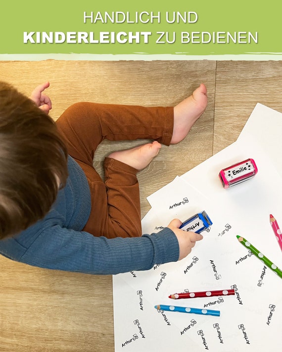 Nie wieder verlorene Schulsachen! Mit diesem personalisierten Stempel kannst du alles von deinem Kind markieren - Kleidung, Bücher, Masken, Turnsachen. Einfach Stempel aufdrücken und der Name ist da! Die Tinte ist waschbeständig und verblasst nicht. Für Stoffe die nicht bedruckbar sind, gibt's einen Bügelgürtel dazu - Name aufdrucken, ausschneiden, aufbügeln - fertig! Stempelgröße: 3,5x5,5cm, Abdruck: 0,9x2,7cm. Wichtig: Vor dem ersten Gebrauch mehrmals test-drücken! In hübscher Box verpackt - perfekt als Geschenk zur Einschulung oder für den Kindergarten. Einfach Text und Farbe personalisieren - und schon hat dein Kind seine eigenen Markenzeichen!