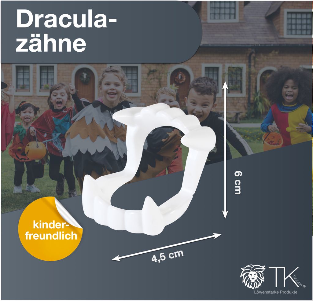 Boooo! Mit diesen gruseligen Vampirzähnen werden deine Kinder zum Star auf jeder Halloween-Party! Im Set sind 5 Zähne: 4 weiße und 1 grüner Zahn für extra Gruselfaktor. Mit 6,5x4,3x1cm perfekt für Kinder geeignet. Aus robustem Kunststoff, angenehm zu tragen und halten sicher im Mund. Einfach reinstecken und schon verwandeln sich deine Kleinen in echte Graf Draculas! Perfekt für Halloween, Karneval, Mottopartys oder Theateraufführungen. Leicht zu reinigen mit Wasser - können immer wieder verwendet werden. Die realistischen Details machen jedes Vampir-Kostüm komplett. Achtung: Garantiert für Gänsehaut und begeisterte Kinderaugen! Einfach super für alle kleinen Gruselfans.