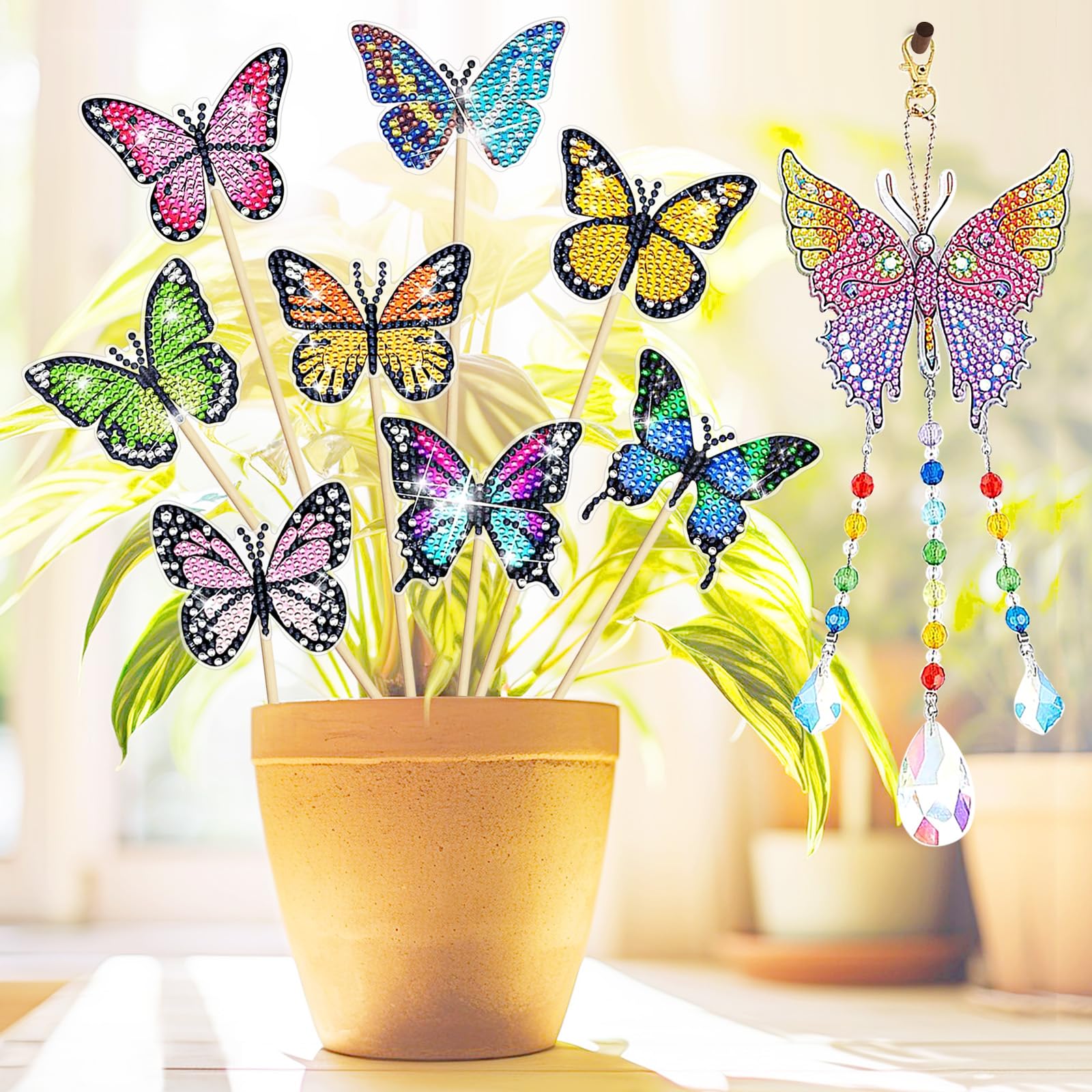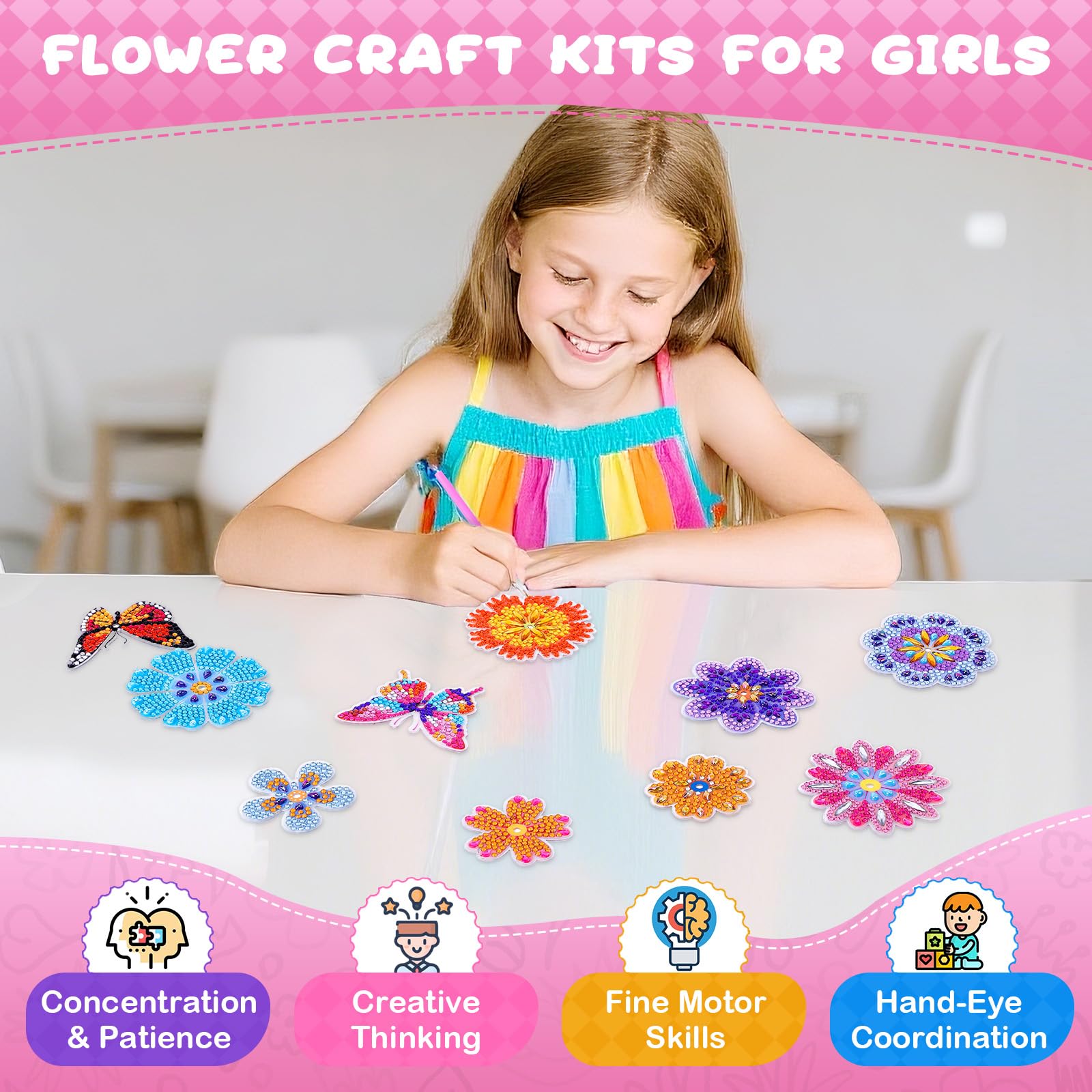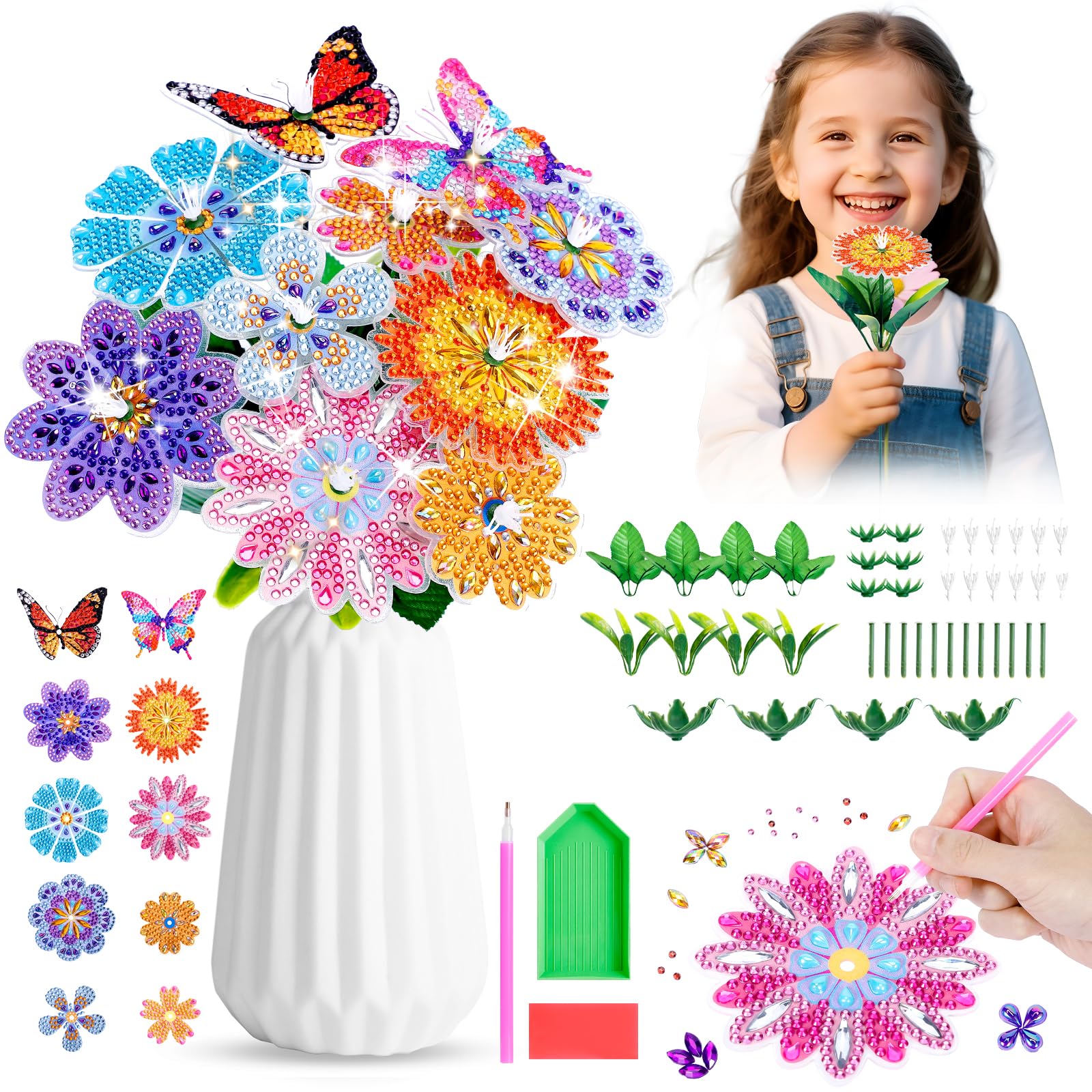 Kreativer Bastelspaß für kleine Künstlerinnen! Dieses Diamond Painting Blumen-Set enthält alles, um wunderschöne, glitzernde Blumensträuße zu kreieren. Im Lieferumfang findest du 4 große Blumen, 4 kleine Blumen, 2 Schmetterlinge, verschiedene Blätter, Blütenansätze, Stempelkappen, Blumenstiele und natürlich die funkelnden Diamanten. Einfach die Schutzfolie von den Blüten entfernen, mit dem Spezialstift Kleber auftragen und die Diamanten nach Zahlen oder Buchstaben aufkleben. Dann werden die Blumen-Nadeln durch die Öffnungen gesteckt, mit den Stielen verbunden und mit den dekorativen Blättern versehen. Falls etwas locker sitzt, hilft das mitgelieferte Klebeband. Das Set fördert die Feinmotorik, Konzentration und Kreativität von Kindern ab 5 Jahren. Perfekt für verregnete Nachmittage oder als gemeinsames Projekt mit Eltern oder Freunden. Die bunten Diamant-Blumen und Schmetterlinge sehen nicht nur während des Bastelns toll aus, sondern ergeben afterwards wunderschöne Dekorationen fürs Kinderzimmer, Wohnzimmer oder als Geschenk. Achtung: Enthält kleine Teile - nicht geeignet für Kinder unter 3 Jahren! Die Blumen sind aus umweltfreundlichem Acryl und Harz gefertigt, robust und langlebig. Ein ideales Geschenk für Geburtstage, Weihnachten oder einfach so - die strahlenden Farben und der Glitzereffekt begeistern jedes Mädchen. Die Anleitung ist leicht verständlich und die Kinder können sofort loslegen. Die fertigen Blumensträuße machen sich super in Vasen oder als Tischdekoration. Ein Bastelset, das lange Freude bereitet und tolle Ergebnisse liefert!