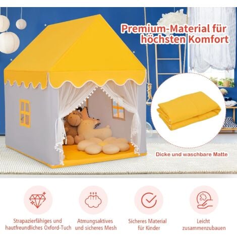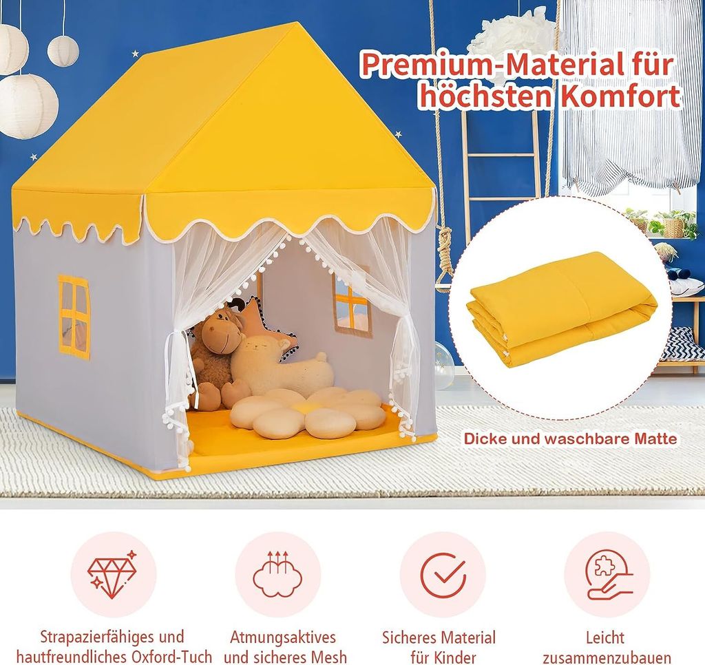Wow, was für ein traumhaftes Spielzelt! Deine Kinder werden diesen eigenen kleinen Rückzugsort lieben. Das FANTASK Kinderzelt ist nicht nur super süß, sondern auch richtig stabil gebaut. Der Rahmen besteht aus massivem Kiefernholz - das hält auch wildem Spielstand stand! \\n\\nMit 120x105x140cm ist es richtig geräumig drin. Da passt nicht nur dein Kind rein, sondern auch noch Freunde oder Kuscheltiere! Die weiche Baumwolldecke macht es total gemütlich zum Spielen, Lesen oder sogar für ein Nickerchen. \\n\\nDas Tolle: Der Oxford-Stoff ist ungiftig und geruchlos - also absolut sicher für Kinder. Die niedlichen Türen und Fenster sorgen für frische Luft und machen das Zelt noch charmanter. \\n\\nEinfach aufbauen und schon kann der Spielspaß beginnen! Perfekt fürs Kinderzimmer, aber auch für Kindergarten oder Spielplatz. \\n\\nNoch mehr Vorteile: \\n- Waschbare Decke für langfristigen Gebrauch \\n- Netzvorhang für einfachen Zugang \\n- Fördert Kreativität und soziales Spielen \\n- In Pink, Blau, Grau und Beige erhältlich \\n\\nEin absolutes Must-Have für kleine Prinzen und Prinzessinnen! Das Zelt wiegt nur 5,5kg und ist damit auch super zu transportieren. Einfach aufstellen und staunen, wie viel Spaß dein Kind damit hat!