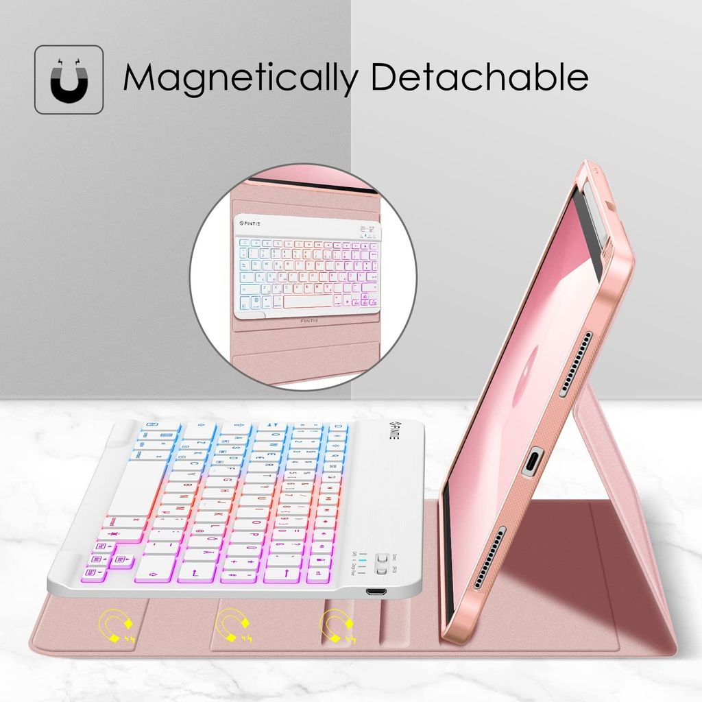 Mach aus deinem iPad ein Mini-Laptop! Diese coole FINTIE Hülle mit integrierter Tastatur ist perfekt für alle, die viel tippen. Die Tastatur hat sogar 7 verschiedene Beleuchtungsfarben und 3 Helligkeitsstufen - sieht nicht nur mega aus, sondern du kannst auch bei Dunkelheit super tippen. Besonders praktisch: Der Apple Pencil hat seinen eigenen Halter und auch der Adapter findet Platz. Die Tastatur ist abnehmbar und verbindet sich per Bluetooth mit deinem iPad. Passt genau fürs iPad 11. Generation 2025 (11 Zoll) und iPad 10. Generation 2022 (10,9 Zoll). Die Hülle ist super schlank (nur 0,96 cm dick) und schützt dein iPad trotzdem zuverlässig. Einfach das iPad reinstecken und schon wird's zum praktischen Arbeitsgerät!