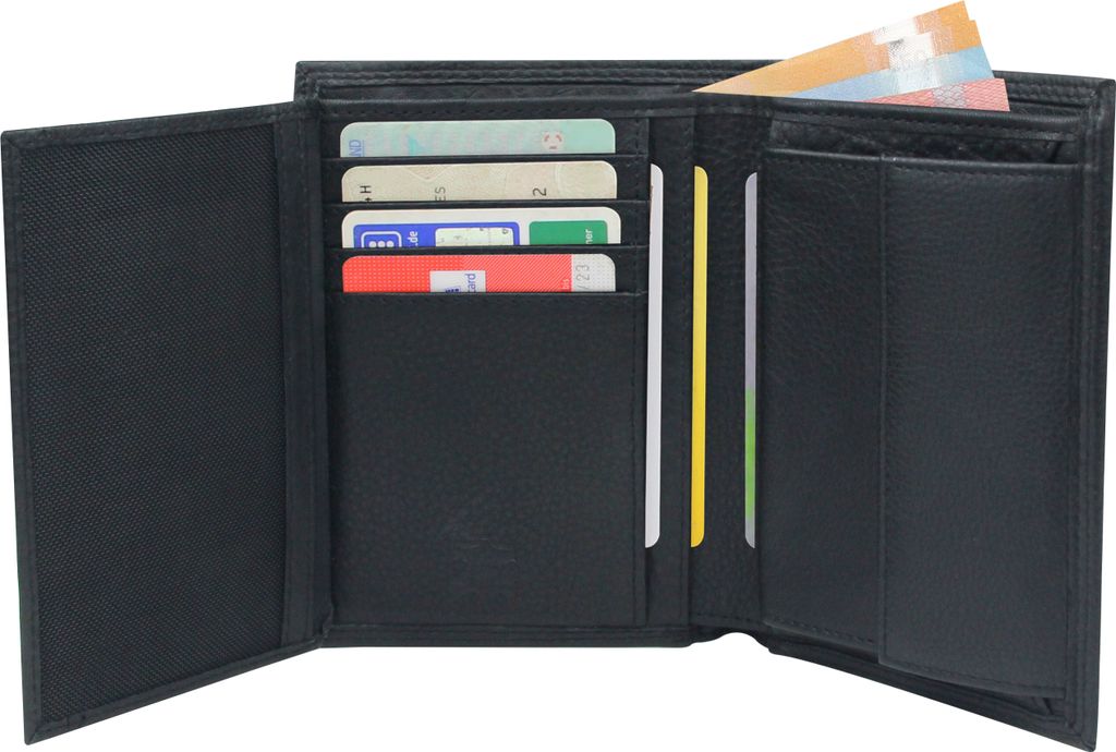 Mit 12 Kartenfächern, davon einem mit Sichtfenster, hast du Platz für alle deine Karten. Dazu kommen 4 große Fächer für Ausweise, 2 Geldscheinfächer, ein Münzfach und ein Sicherheitsfach mit Reißverschluss.