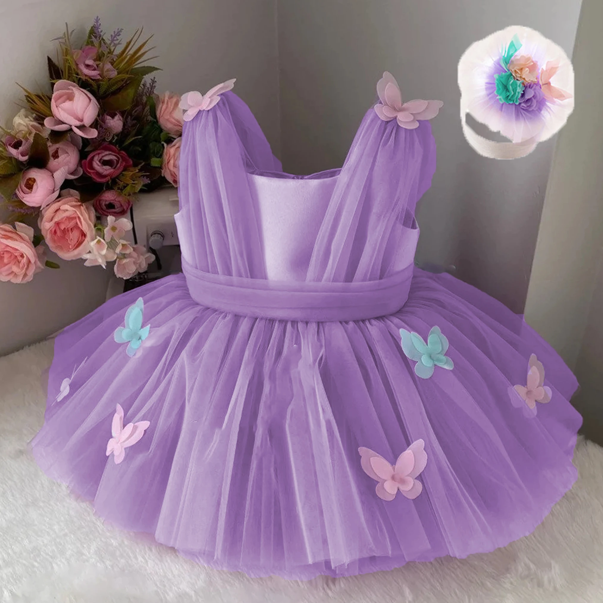 Verwandle deine kleine Prinzessin in die Hauptattraktion jeder Feier! Dieses bezaubernde Ballkleid aus weichem Tüll und Polyester lässt Mädchenherzen höherschlagen. Mit seinem transparenten Mesh-Oberteil und den niedlichen 3D-Blumen am Ausschnitt sieht es nicht nur luxuriös aus, sondern ist auch super bequem zu tragen. Der mehrschichtige Rock besteht aus satten 5 Lagen: eine mit funkelnden 3D-Schmetterlingen, zwei weiche Tüllschichten, eine Satinlage und ein hautfreundliches Baumwollfutter. So steht der Rock perfekt und bauscht sich wunderschön auf, ohne zu kratzen. Perfekt für den 1., 2. oder 3. Geburtstag, als Blumenmädchen bei Hochzeiten, für Taufen, Familienfotos oder einfach nur zum Spielen und Träumen. Der unsichtbare Reißverschluss hinten macht das Anziehen zum Kinderspiel, und die verschiedenen Größen passen für 6 Monate bis 3 Jahre. Ein ideales Geschenk für Töchter, Enkelinnen oder Nichten - denn jedes Mädchen verdient einen Tag als Prinzessin! Wichtig: Nur Handwäsche, dann bleibt das Kleid lange wunderschön.
