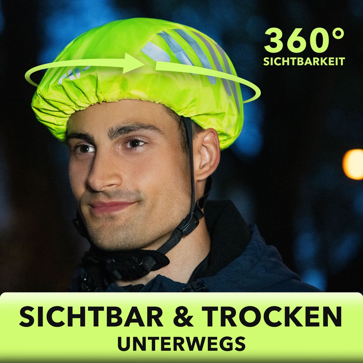Regen überrascht dich beim Radfahren? Diese Regenhaube für deinen Fahrradhelm hält dich trocken und sichtbar! Die neongrüne Farbe mit reflektierenden Elementen sorgt dafür, dass dich alle sehen - auch bei schlechtem Wetter. Wasserdicht und winddicht schützt sie deinen Helm vor Nässe, ohne dass sich Hitze staut. Passt für die meisten Helme dank des verstellbaren Gummizugs von 53-90cm Umfang. Einfach überziehen und schon bist du bereit für den nächsten Regenschauer! Kompakt zusammengefaltet passt sie in jede Jackentasche. Perfekt für Pendler, Sportler oder einfach alle, die bei jedem Wetter Rad fahren wollen. Endlich kein nasser Helm mehr - einfach praktisch!