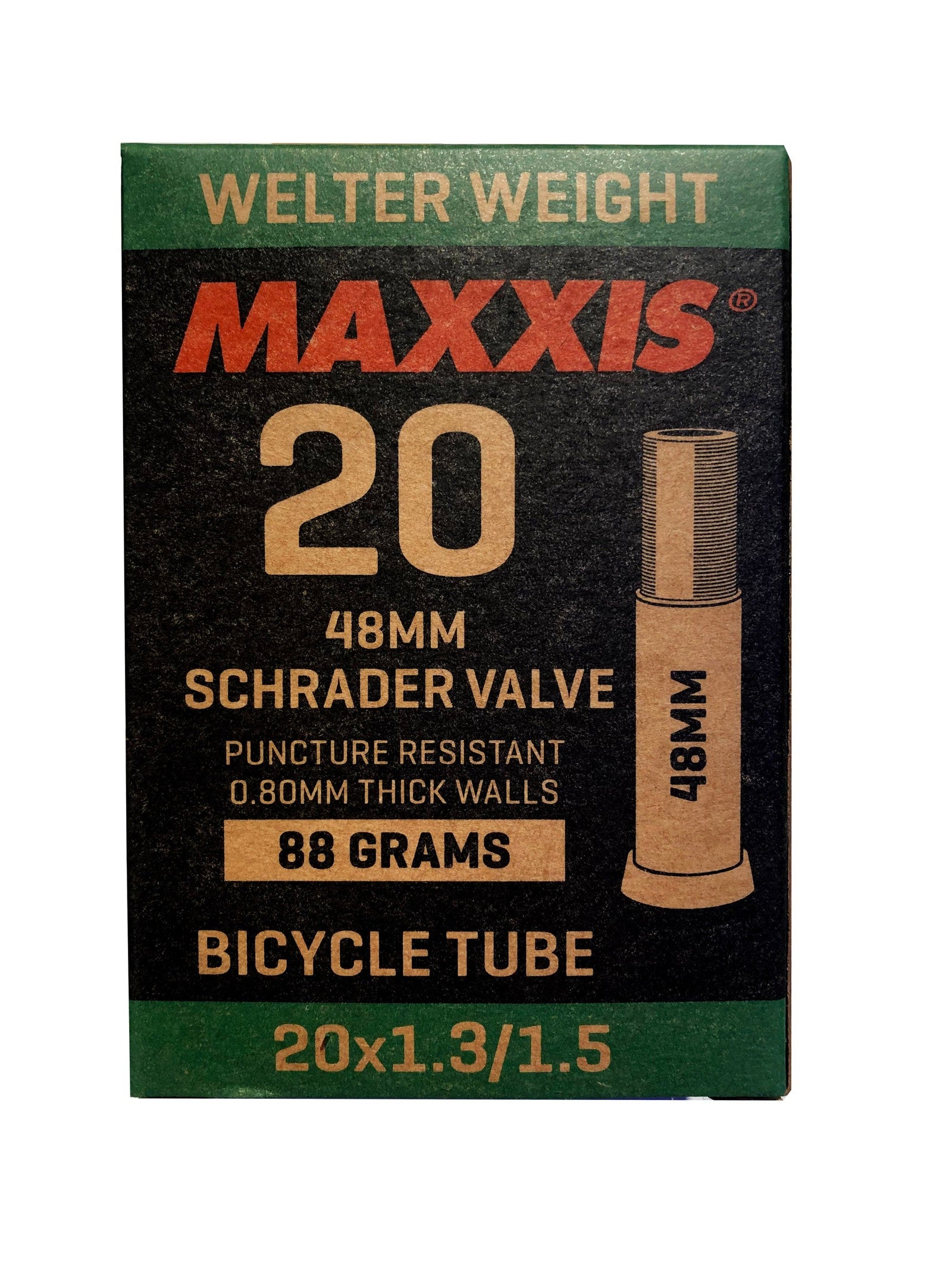 Platten adé! Mit dem Maxxis Welter Weight Fahrradschlauch bist du optimal für deine Mountainbike- oder Trekking-Touren ausgerüstet. Dieser hochwertige Schlauch ist speziell für 27,5 Zoll Räder konzipiert und passt perfekt zu Reifenbreiten zwischen 1,90 und 2,35 Zoll - also ideal für die meisten modernen Mountainbikes.\\n\\nDas Presta Ventil (48 mm) ist super praktisch für schmale Felgen und ermöglicht einfaches, präzises Aufpumpen. Kein Gefummel mehr mit zu kurzen Ventilen! Der Schlauch ist aus robustem Material gefertigt und besonders widerstandsfähig gegen Durchstiche - wichtig bei unwegsamem Gelände.\\n\\nOb bei ruppigen Trails, Waldwegen oder der täglichen Stadtfahrt - dieser Schlauch hält, was er verspricht. Und das geringe Gewicht der Welter Weight Serie sorgt dafür, dass dein Bike nicht unnötig schwer wird.\\n\\nTechnische Daten im Überblick:\\n• Für 27,5 Zoll Räder\\n• Reifenbreite: 1,90 - 2,35 Zoll\\n• Presta Ventil, 48 mm Länge\\n• Farbe: Schwarz\\n• Verpackungsgewicht: 180 Gramm\\n• Kompakte Verpackung: 5,5 x 7,5 x 11,5 cm\\n\\nPerfekt als Ersatzschlauch für unterwegs oder zum Wechseln deines alten, abgenutzten Schlauches. Einfach mitnehmen und im Ernstfall schnell eingebaut - so macht Radfahren wieder Spaß!\\n\\nTipp: Immer einen Ersatzschlauch dabei haben - denn Platten kommen immer dann, wenn man sie am wenigsten brauchen kann!