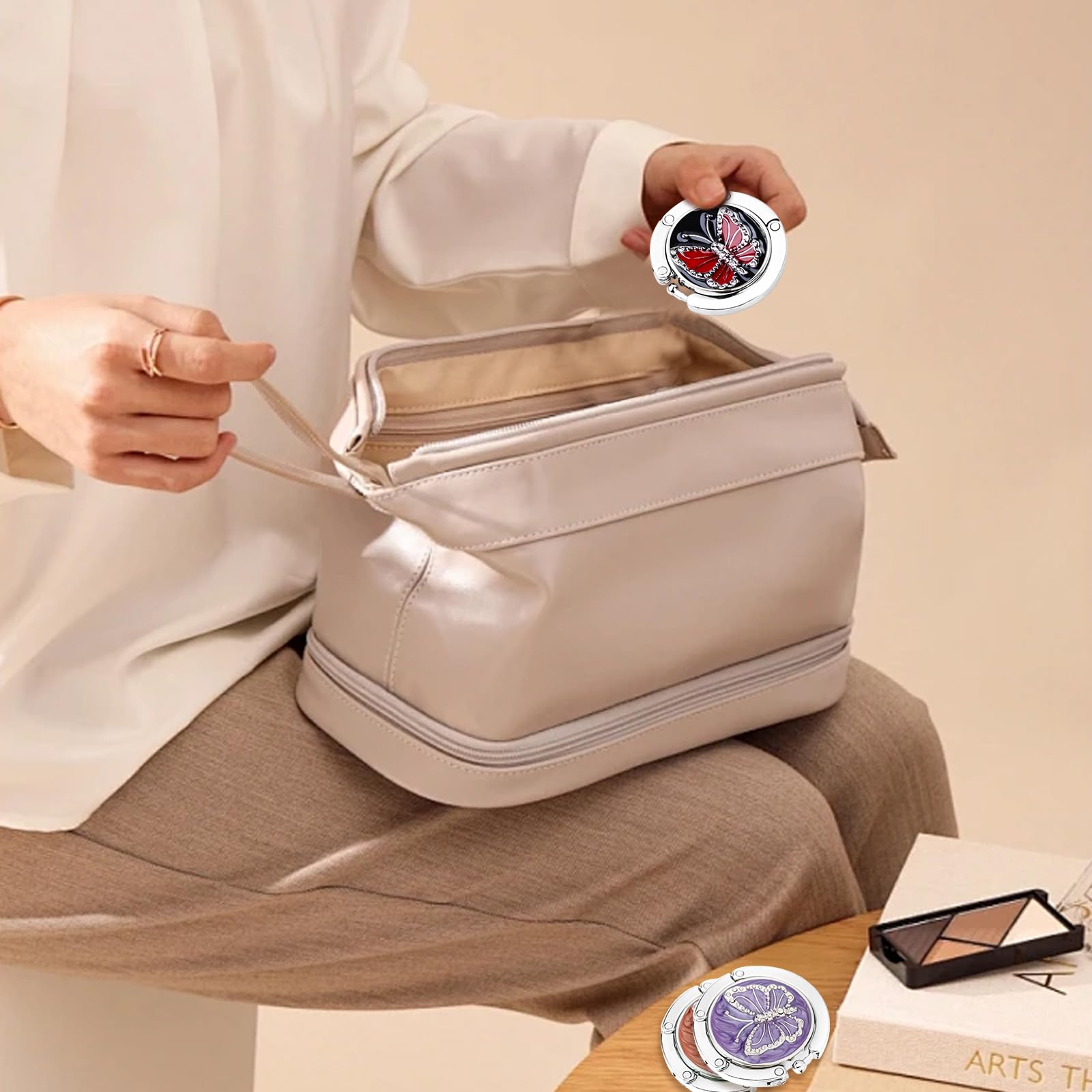 Nie wieder die Tasche auf dem schmutzigen Boden! Diese eleganten Handtaschenhalter in Marmor-Optik halten deine Tasche sicher und sauber. Im 2er-Set - einer für dich, einer für die Freundin. Aus robuster Zinklegierung mit rutschfester Unterseite. Faltbar und super leicht - passt in jede Handtasche. Einfach aufklappen, auf den Tisch stellen und Tasche aufhängen. Perfekt für Restaurant, Büro, Café oder Gartenparty. Schont teure Handtaschen und gibt ein stylisches Accessoire ab. Ein praktisches Geschenk für jede modebewusste Frau!