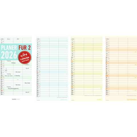 Organisationschaos in der Familie? Dieser Alpha Edition Planer für Zwei bringt Ordnung in deinen Alltag! Mit drei klaren Spalten perfekt für Paare, WGs oder kleine Haushalte. Im großzügigen 22x45cm Format findest du genug Platz für alle Termine, Geburtstage und Verabredungen. Enthält alle wichtigen Feiertage für Deutschland, Österreich, Schweiz, Frankreich und Italien plus Ferientermine - ideal für die Urlaubsplanung! Gedruckt auf hochwertigem FSC-zertifiziertem Papier aus nachhaltiger Forstwirtschaft. Hergestellt in Deutschland mit stabiler Spiralbindung und Aufhängevorrichtung. Der zusätzliche Notizbereich unter dem Kalendarium bietet Platz für wichtige Notizen. Ein echter Alltagsheld, der dir hilft, das Jahr 2026 perfekt organisiert zu meistern!