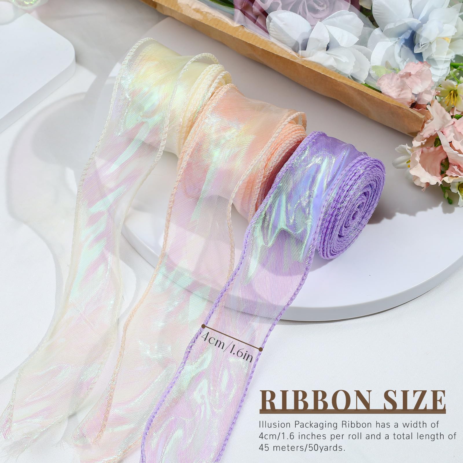 Verpacke deine Geschenke mit Stil! Dieses wunderschöne Organza-Band in vier zarten Farben (Lila, Rosa, Beige, Blau) verleiht jedem Präsent das gewisse Etwas. Jede Rolle ist 4 cm breit und satte 9 m lang - da reicht's für viele Geschenke! Das halbtransparente Band schimmert je nach Lichteinfall und sieht einfach elegant aus. Perfekt für Hochzeitsgeschenke, Geburtstagspäckchen, Weihnachtsüberraschungen oder zur Deko von Blumensträußen. Aber nicht nur für Geschenke: Bastle damit wunderschöne Schleifen, Haarschmuck oder dekoriere dein Zuhause. Aus hochwertigem Polyester, leicht zu schneiden und zu verarbeiten. Deiner Kreativität sind keine Grenzen gesetzt!