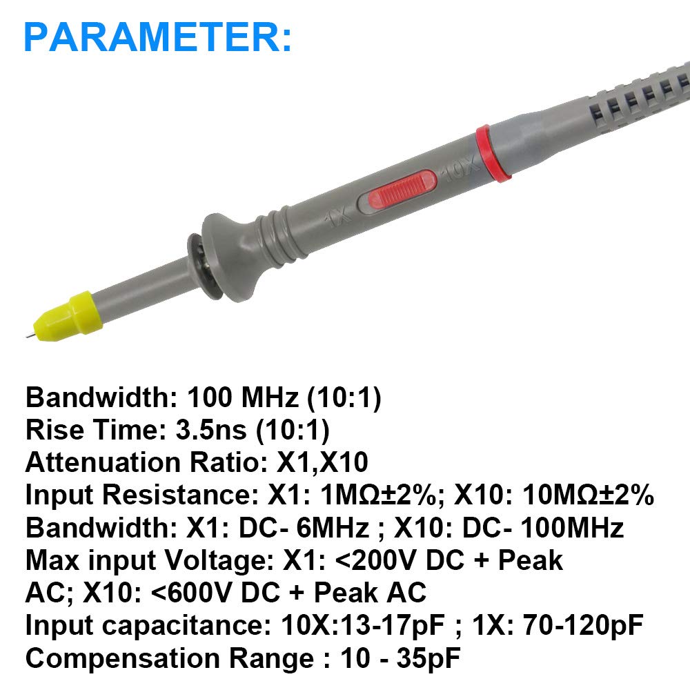 Moin! Die Fasizi P6100 Oszilloskop-Sonden sind professionelles Zubehör für alle Elektronik-Begeisterten und Techniker. Mit 100 MHz Bandbreite und einer Dämpfungsrate von 1x/10x bist du für verschiedene Messaufgaben bestens ausgerüstet. Die Sonden haben einen Eingangswiderstand von 1 MΩ bzw. 10 MΩ und vertragen bis zu 600 V Gleichspannung. Die 120 cm langen Kabel geben dir genug Spielraum bei deinen Messungen. Technische Details: Eingangskapazität bei 1x: 85-135pF, bei 10x: 18,5-22,5pF. Die Anstiegszeit beträgt bei 10x nur 1,75 ns - mehr als ausreichend für präzise Messungen! Der Kompensationsbereich liegt zwischen 15-45pF. Ob im Labor, in der Werkstatt oder für Hobby-Projekte - diese Sonden liefern zuverlässige Ergebnisse. Die mitgelieferten Clip-Kabel machen das Anschließen super einfach. Betriebstemperatur von -10°C bis 50°C - also für den normalen Einsatz mehr als ausreichend. Perfekt also wenn du dein Oszilloskop mit qualitativem Zubehör aufrüsten willst ohne ein Vermögen auszugeben!