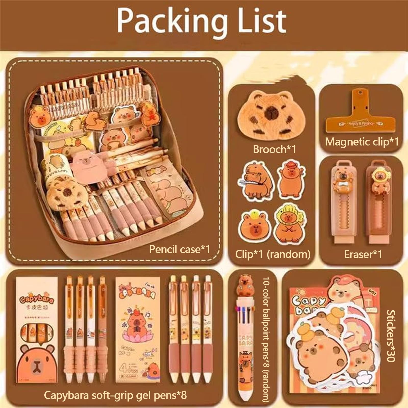 Oh, wie süß! Dieses Capybara Federmäppchen-Set ist einfach der Hit für alle Schulkinder und Capybara-Fans. Im Set enthalten ist nicht nur das niedliche Federmäppchen aus robustem Oxford-Stoff, sondern auch 18 Stifte, 4 Haftnotizen, Aufkleber, eine Capybara-Puppe, 3 Clips, Lineale, Broschen und ein Schlüsselanhänger. Mit den Maßen 23x14x5 cm bietet das Mäppchen genug Platz für alle Schreibutensilien. Die waschbare Oberfläche macht die Reinigung super einfach. Perfekt für Schule, Büro oder unterwegs. Als Geschenk für Geburtstage oder besondere Anlässe einfach ideal - damit macht Lernen und Schreiben gleich doppelt so viel Spaß!
